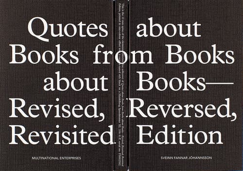 «Quotes about Books from Books about Books» is an artist's book, an exhibition, and a library of books about books, including periodicals, journals, exhibition catalogues, zines, monographs, and artists’ books spanning 1974–2025. Edited and compiled by Sveinn Fannar Jóhannsson, the project presents 148 quotes, drawn from his archive of printed matter, that reflect on the book as medium, material, and metaphor. The accompanying exhibition makes each source publication physically accessible to visitors—creating a participatory experience that mirrors the democratic ethos of independent publishing.
