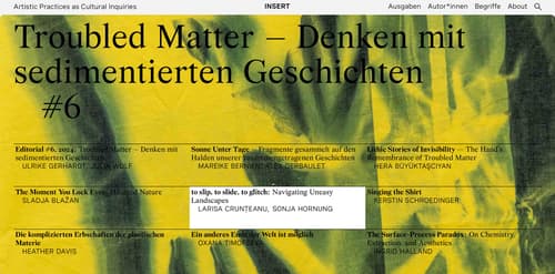 Die sechste INSERT-Ausgabe Troubled Matter – Denken mit sedimentierten Geschichten, hg. von Ulrike Gerhardt und Julia Wolf, untersucht die vielschichtigen Verbindungen zwischen Materialität, Krisen und (künstlerischen) Historiografien, indem sie materielle Spuren als Träger kultureller, sozialer und politischer Bedeutung in den Blick nimmt. Mit der Denkfigur der beunruhigenden Materie (troubled matter) wird ein Konzept entwickelt, das es ermöglicht, mit den sedimentierten Geschichten, die Materie prägen, zu denken. Die Beiträge beleuchten, wie materielle Agency durch spezifische Techniken wahrnehmbar gemacht, künstlerisch beforscht und kulturwissenschaftlich konzeptualisiert werden kann. Die Ausgabe lädt dazu ein, Materialität im Spannungsfeld geologischer Traumata und eines ,Noch-nicht-Benannten‘ neu zu verstehen.