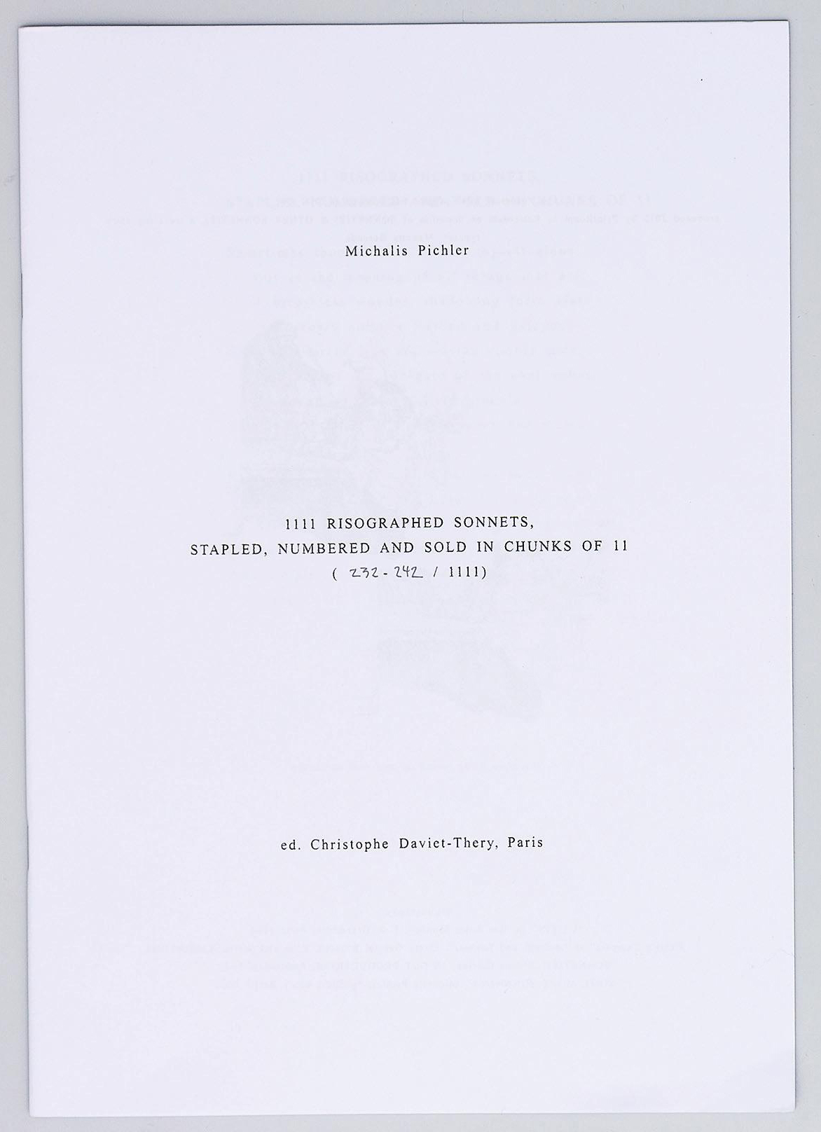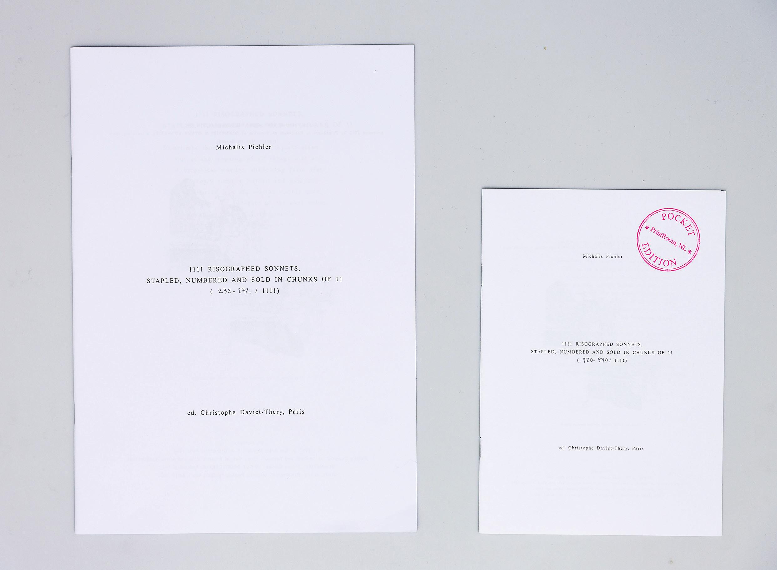 1111 RISOGRAPHED SONNETS, STAPLED, NUMBERED AND SOLD IN CHUNKS OF 11