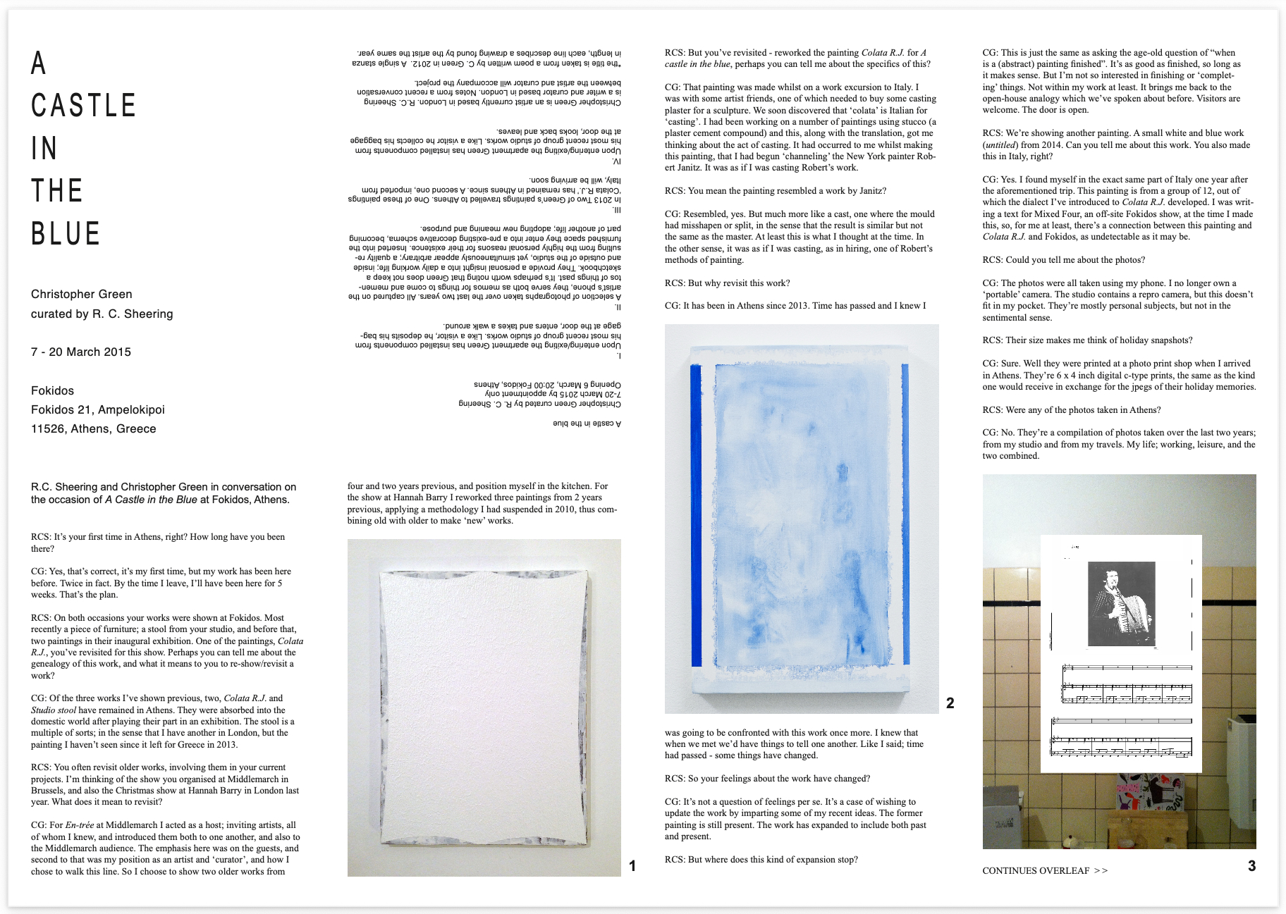 Exhibition catalogue for artist Christopher Green's 2015 solo exhibition at Fokidos, Athens. The catalogue features a conversation between myself and curator R.C. Sheering, as well as selected works from the exhibition.