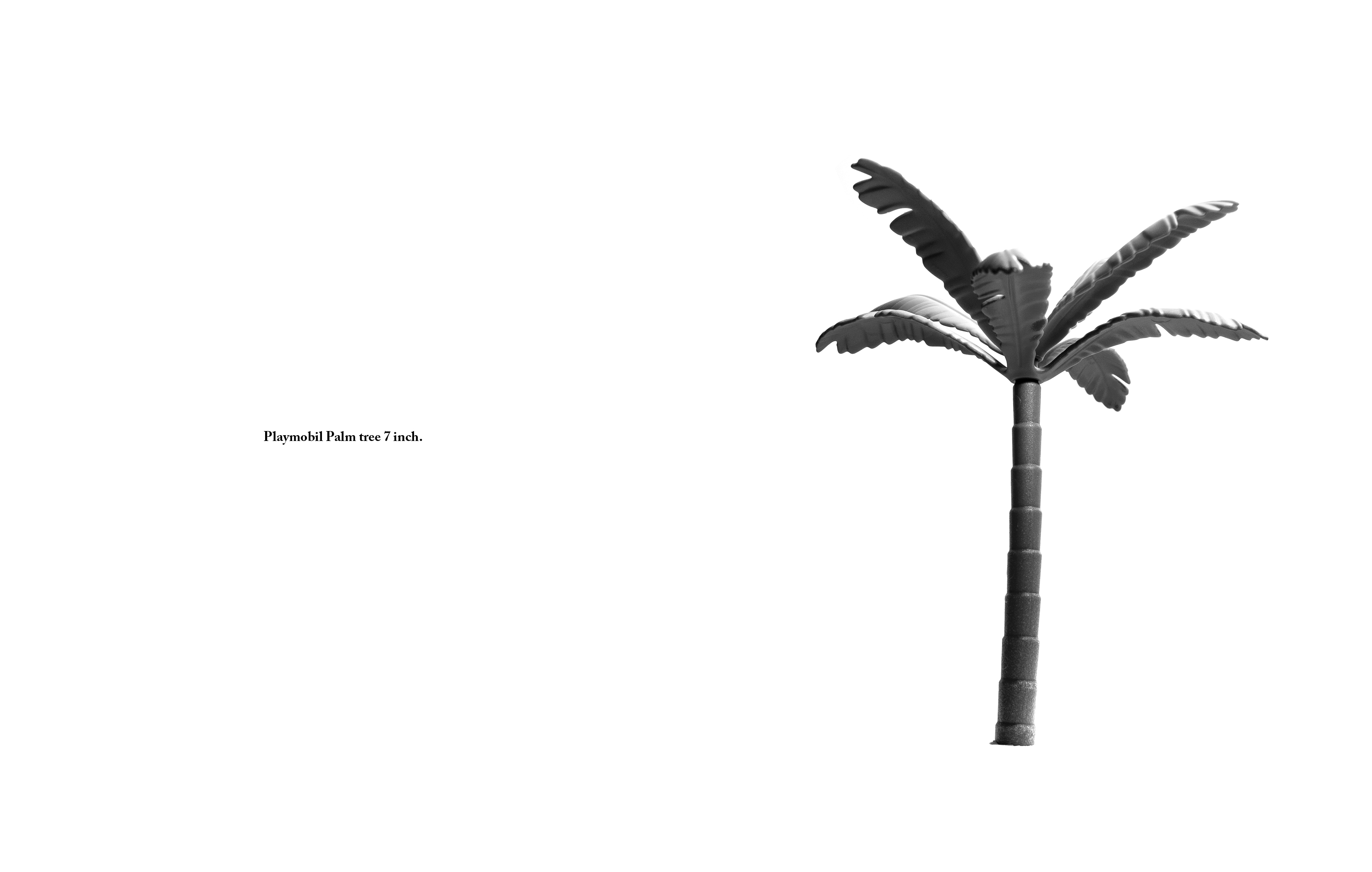 “A Few Model Palm Trees” is a remake, an interpretation, an appropriation, an adaption of Ed Ruscha’s famous book “A Few Palm Trees” from the 70s. Instead of using real palm trees, Roels makes use of downsized plastic trees that are used in architectural scale models, or that are used as children’s toys.