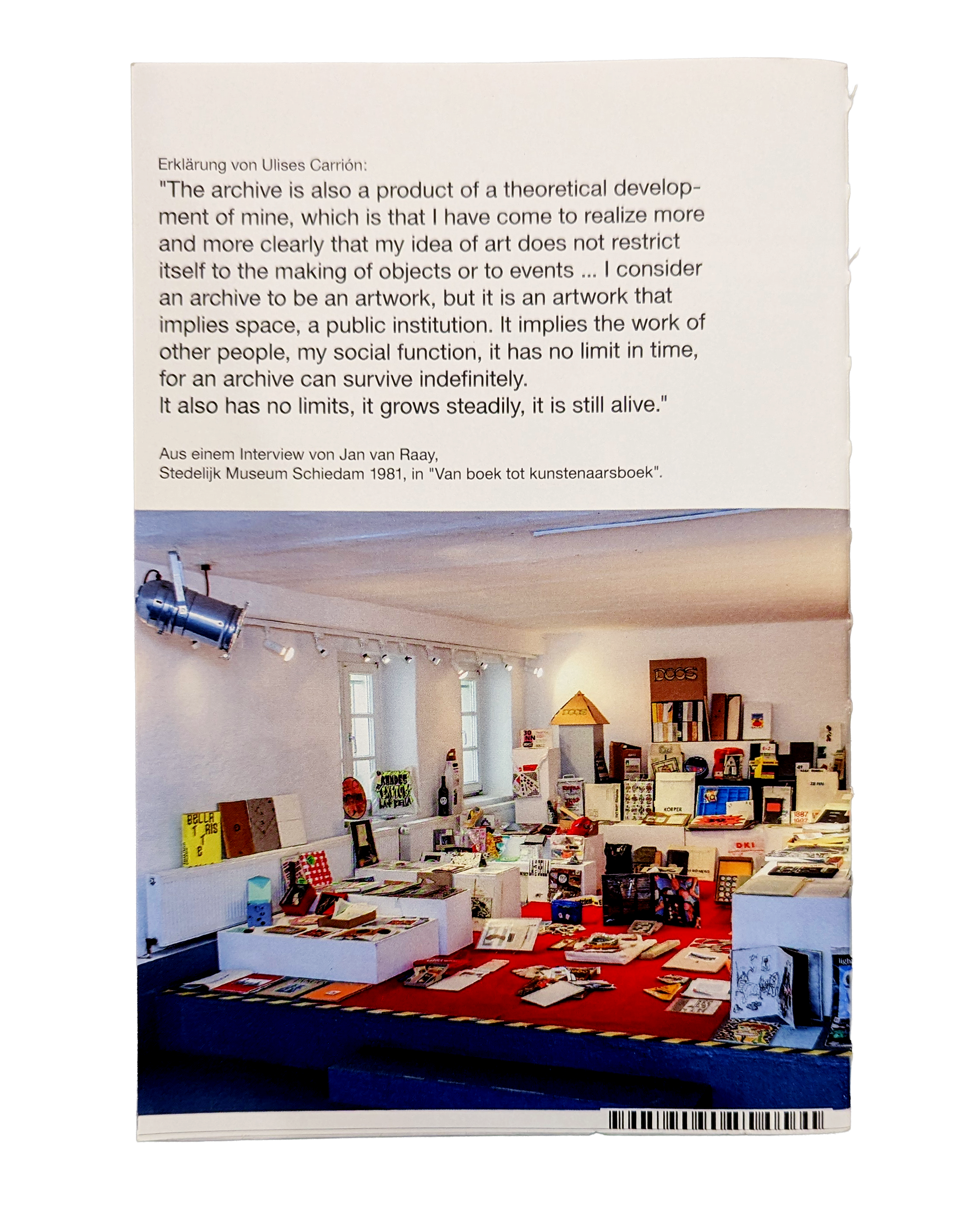 The Künstlerbucharchiv documents artistic activities from the Fluxus and cyber eras, Mail Art, Punk, Concrete and Visual Poetry, Conceptual Art, and everything related to the self-organization of artists, such as producer galleries, studio groups, artist groups and communities, markets, editions, self-publishing houses, workshops, artist initiatives, and much of what artists have undertaken for self-marketing and self-organization since the late 1970s.