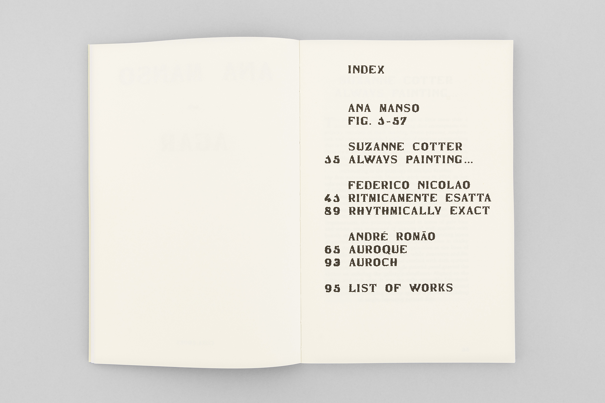 This book surveys the work of Ana Manso (Lisbon, 1984) made over the past few years. Firmly rooted in a regular practice of painting and drawing. Manso’s visual imagination as language is mirrored in the accompanying essays – each presented in the original language – by curator Suzanne Cotter (AUS/UK), philosopher Federico Nicolao (IT), and artist André Romão (PT), who draw on their distinct cultural perspectives.