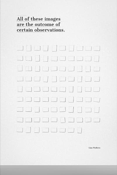 The work All of these images are the outcome of certain observations is a book based on the concept of collection and archiving. Neither a collection nor an archive can consist of only one element – one thing needs another to exist. I have selected a number of works from my own photo archive of everyday scenes and brought them together in this book.