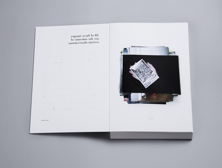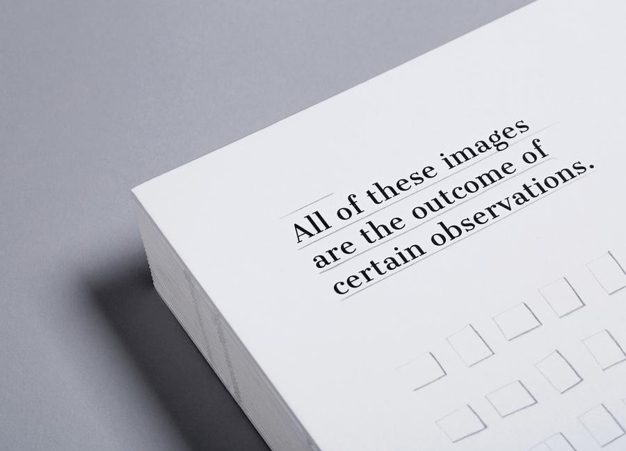 The photographs have been stacked and then photographed again. The physical form of All of these images are the outcome of certain observations is subject to the rules of collecting and archiving: due to its slanted cut, the book requires support from other objects around it in order to stay upright.