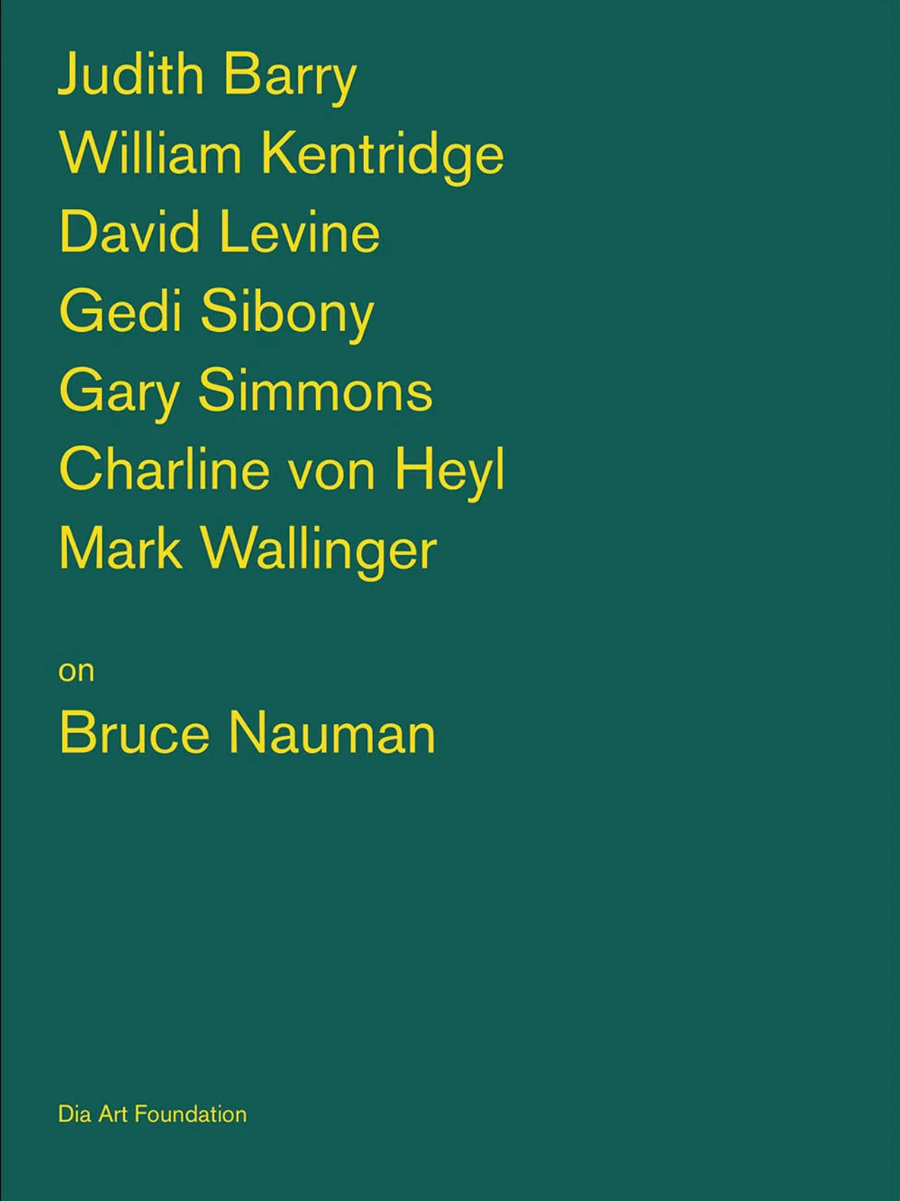 Artists on Bruce Nauman is the fourth volume in a series that takes as its starting point Dia Art Foundation’s Artists on Artists lectures. Established in 2001, the lecture series highlights the work of modern and contemporary artists from the perspective of their colleagues and peers. The contributors to this book contend with Nauman’s relationship to his practice, the space of the studio, humor, and language. Questioning the role of the spectator and channeling Nauman’s inquisitive attitude, Artists on Bruce Nauman features contributions from Judith Barry, William Kentridge, David Levine, Gedi Sibony, Gary Simmons, Charline von Heyl, and Mark Wallinger.
