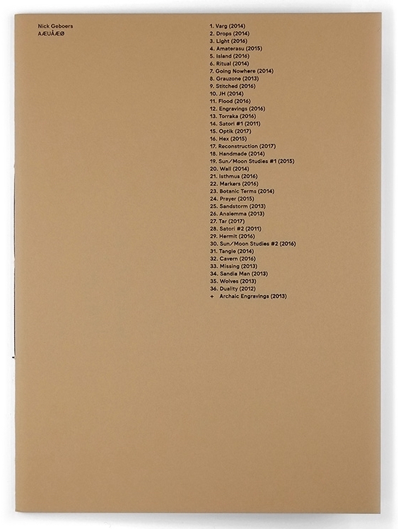The cryptic title forms a sequence of symbols and Danish sounds. AÆUÅÆØ roughly translates to 'I am out on an island'. The photographer therefore invites us to visit an island. What the precise nature of that island could be remains undetermined. In any case, it is not an existing island. The images in this book cannot be read as a documentary inventory of a real existing area, but rather as a poetic evocation of the idea 'island'. They explore the isolation, the sense of seclusion, specific to the existence of the islander. Each photograph is an isolated fragment, the whole a sequence of unfathomable appearances. The sublime landscapes, nature observations, archaic symbols and unknown rituals suggest an animistic world view in which every image, every human trace, seems like an echo of other times.