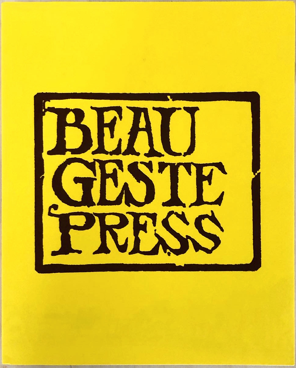 Beau Geste Press was active until 1976, printing publications by visual poets, neo-Dadaists and international artists affiliated with the Fluxus movement. Specialising in limited-edition artists' books, it published the work of its own members, but also that of many of their colleagues worldwide. In the spirit of cottage industry, Beau Geste Press adapted its methods and scale of production to its needs, keeping all stages, from design and printing to distribution, under the same—bucolic—roof.