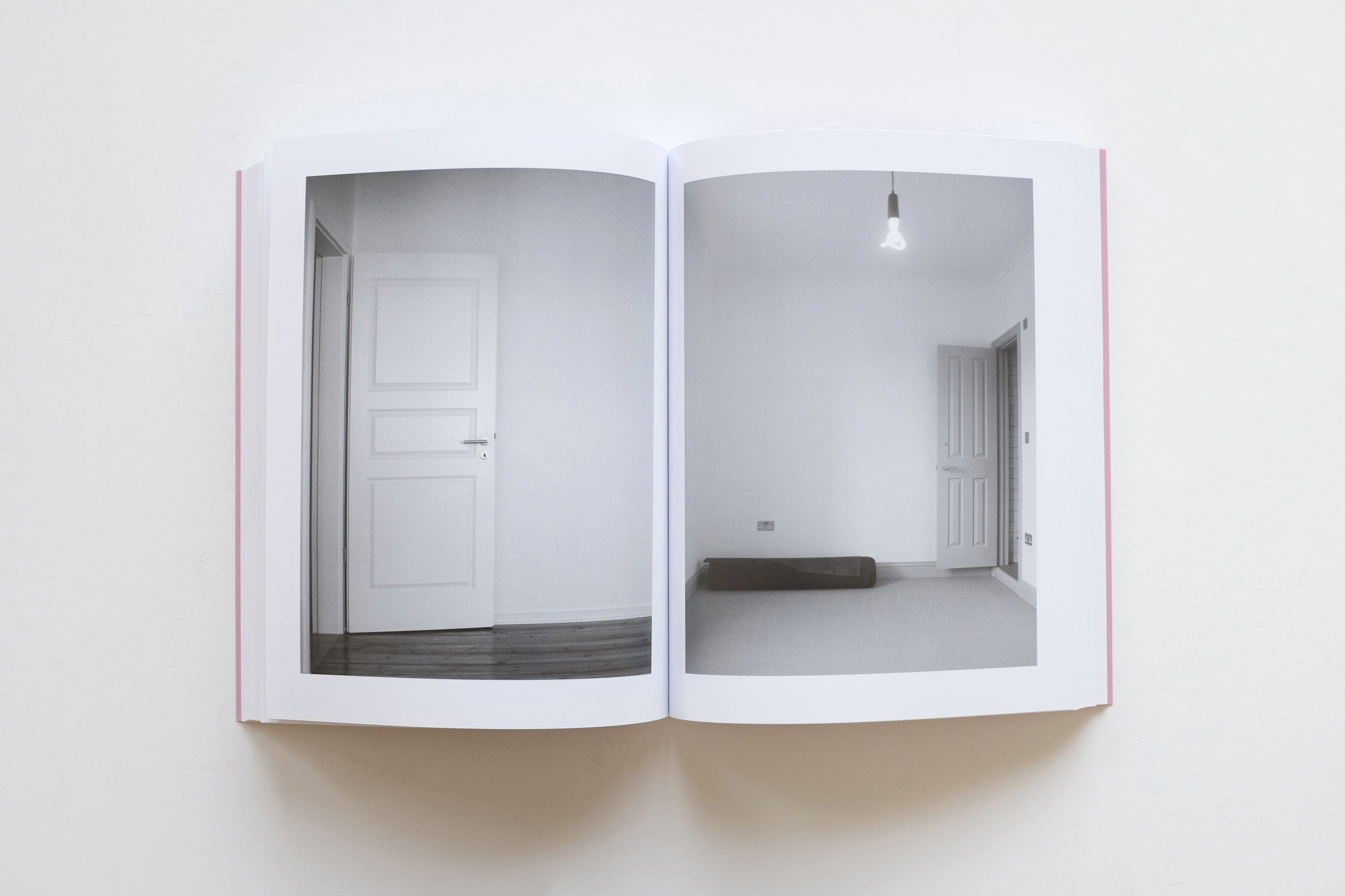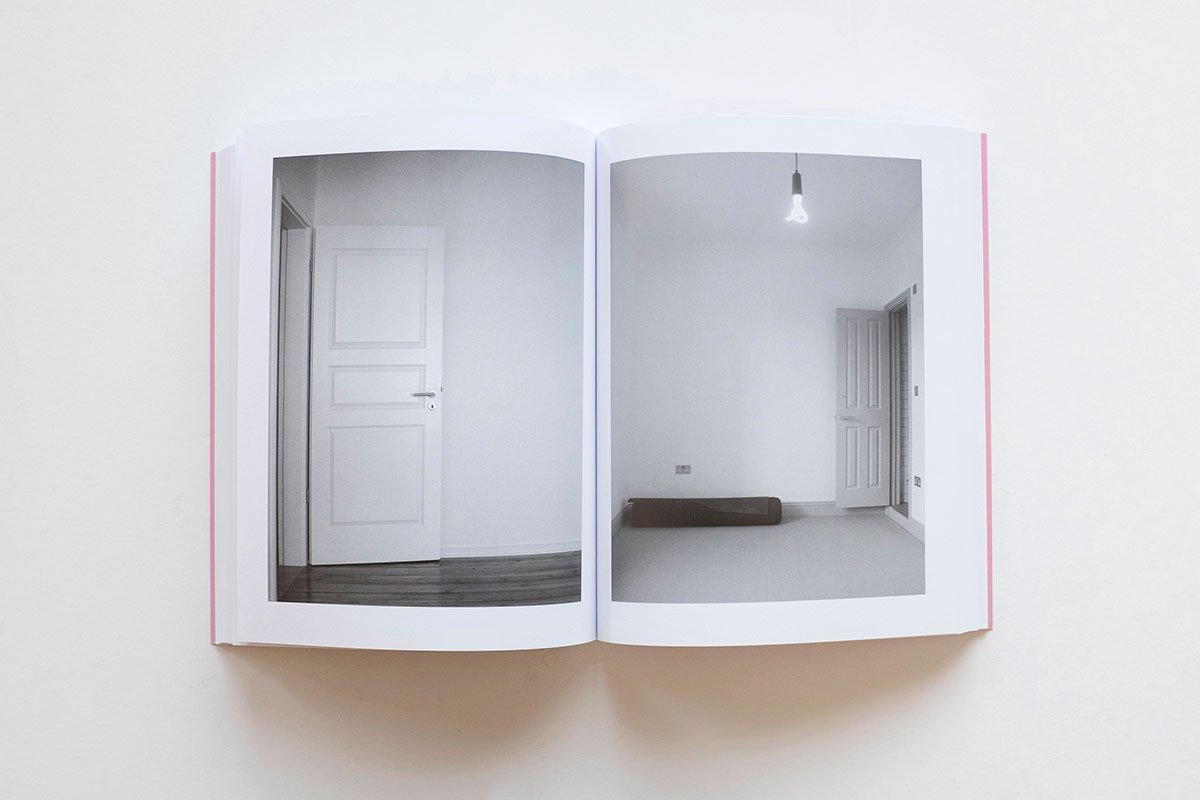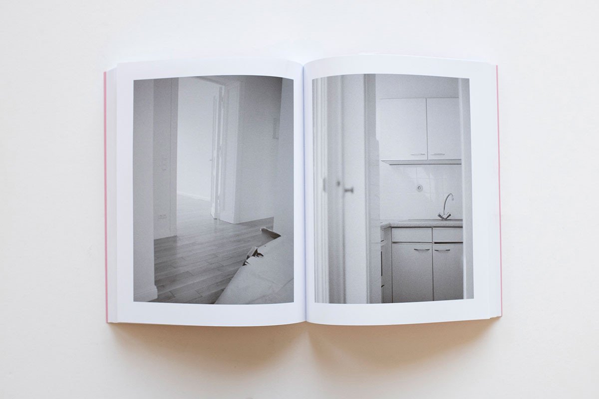 Calla Henkel and Max Pitegoff’s book collects black and white photographs taken at apartment viewings in Berlin, London and Zürich in 2015, and exhibited at Galerie Isabella Bortolozzi in Berlin the same year. The images render a landscape of apartments, mostly empty, punctuated by potential buyers or renters projecting their own possible futures onto the spaces. The photographs blend into each other as if one building, aggregating material treatments,fixtures, flooring, and faucets in their extraordinary specificity; or as if one city, seen from the inside as a picture of a private public sphere. The book includes a new text by writer Pablo Larios elaborating on the staging of personal environments and the relationship between gure and ground in Henkel and Pitegoff’s work.
