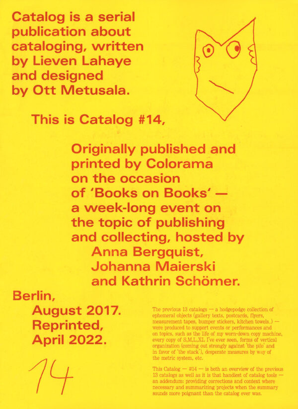 Catalog is a serial publication about cataloging, written by Lieven Lahaye and designed by Ott Metusala. This is Catalog #14, printed by Colorama on the occasion of ‘Books on Books’ — a week-long event on the topic of publishing and collecting, hosted by Anna Bergquist, Johanna Maierski and Kathrin Schömer. Berlin, August 2017.