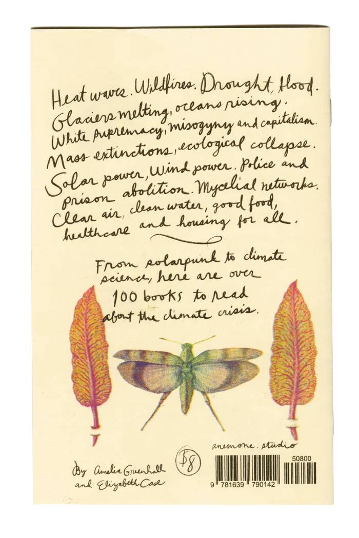 This zine is a starting place, an entryway. This is a list of (mostly) books we (Amelia Greenhall and Elizabeth Case) have read and vetted. It’s a list of what has stuck with us, and some notes on why. It’s a list to try to collect ourselves in the face of an overwhelming force – global climate change – and pour out into the world a little of what it has given us. It is not comprehensive; the readings we chose were deeply informed and shaped by our personal biases, perspectives, and reading preferences.