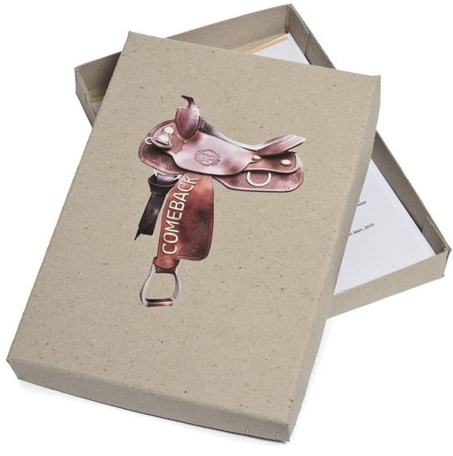 Ca. 60 Graphiken, u.a. Originalzeichnungen, Kopien, Digitaldrucke oder gefundenes Material, vom Künstler mit Texten versehen, von Hand collagiert, bestempelt und beklebt im Stülpkarton mit Aufkleber.