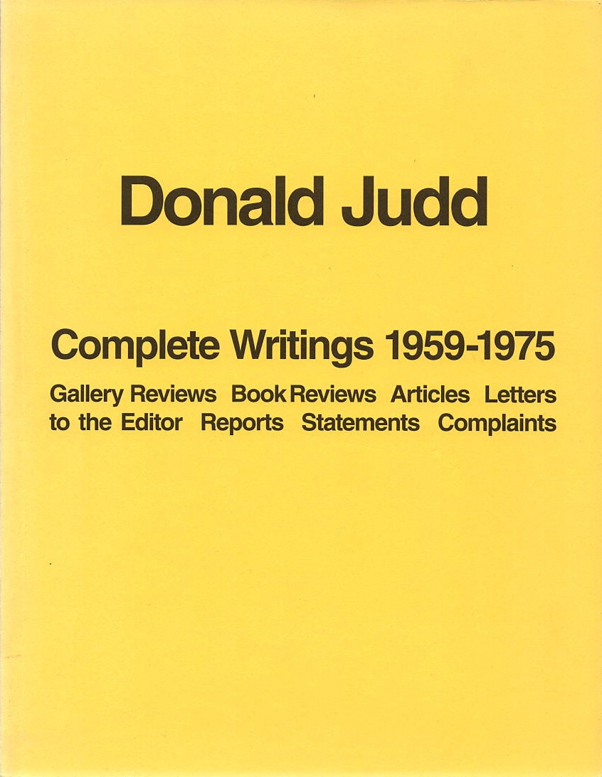 Donald Judd: Complete Writings 1959-1975, first published in 1975, has been the primary source for Judd’s early writing. Working as an art critic for magazines such as Arts, Arts Magazine, and later Art International, Judd regularly contributed reviews of contemporary art exhibitions between 1959 and 1965, but continued to write throughout his life on a broad range of subjects.