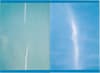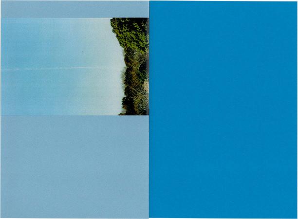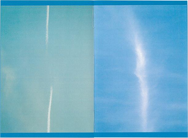 The contrail is extended like drawing a straight line in blue sky. Photo pages unfold on the A5 size flockpapers that make us think of blue sky as new background in this photo book. The slit of the slipcase becomes the white line by seeing through an especially bold contrail.
