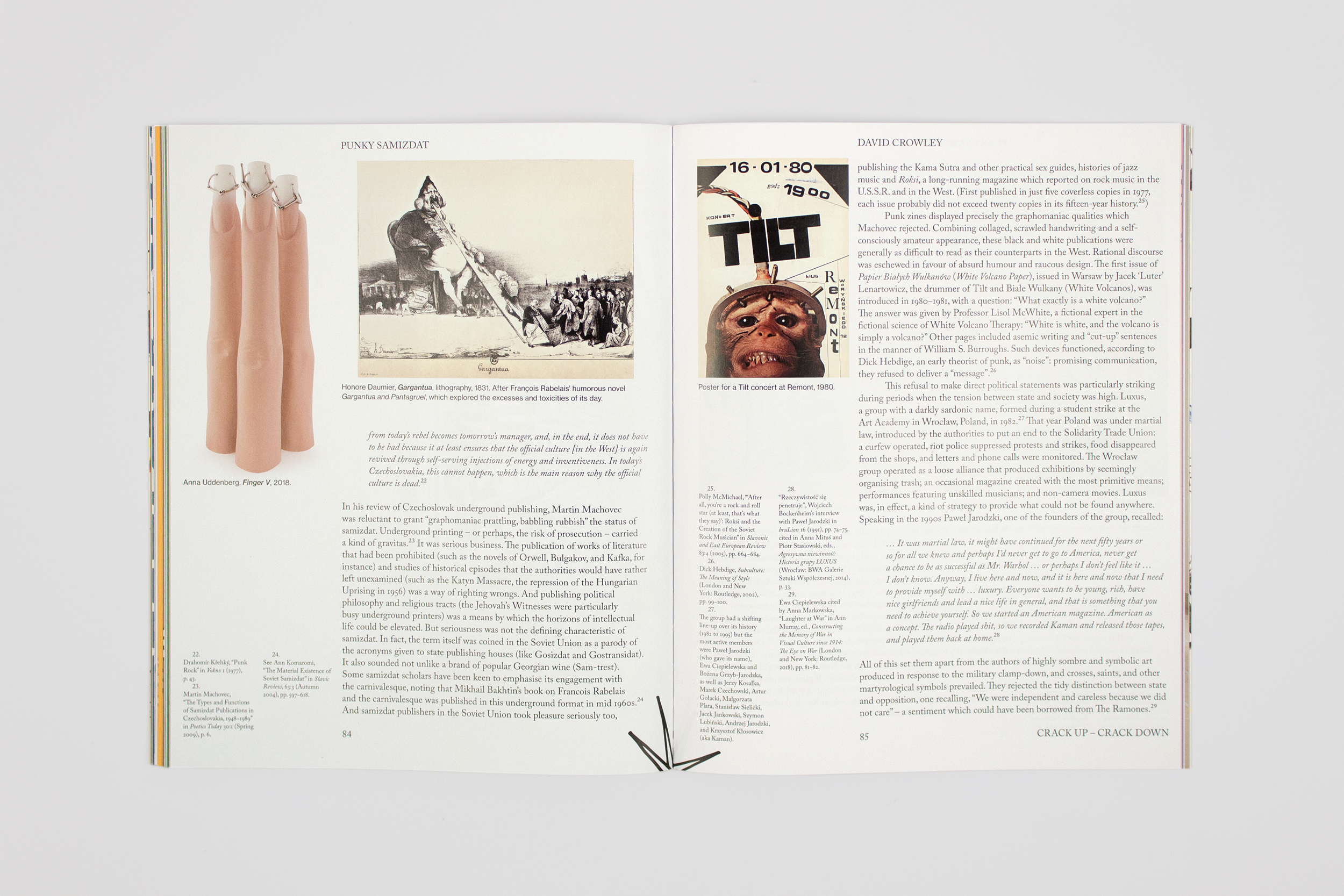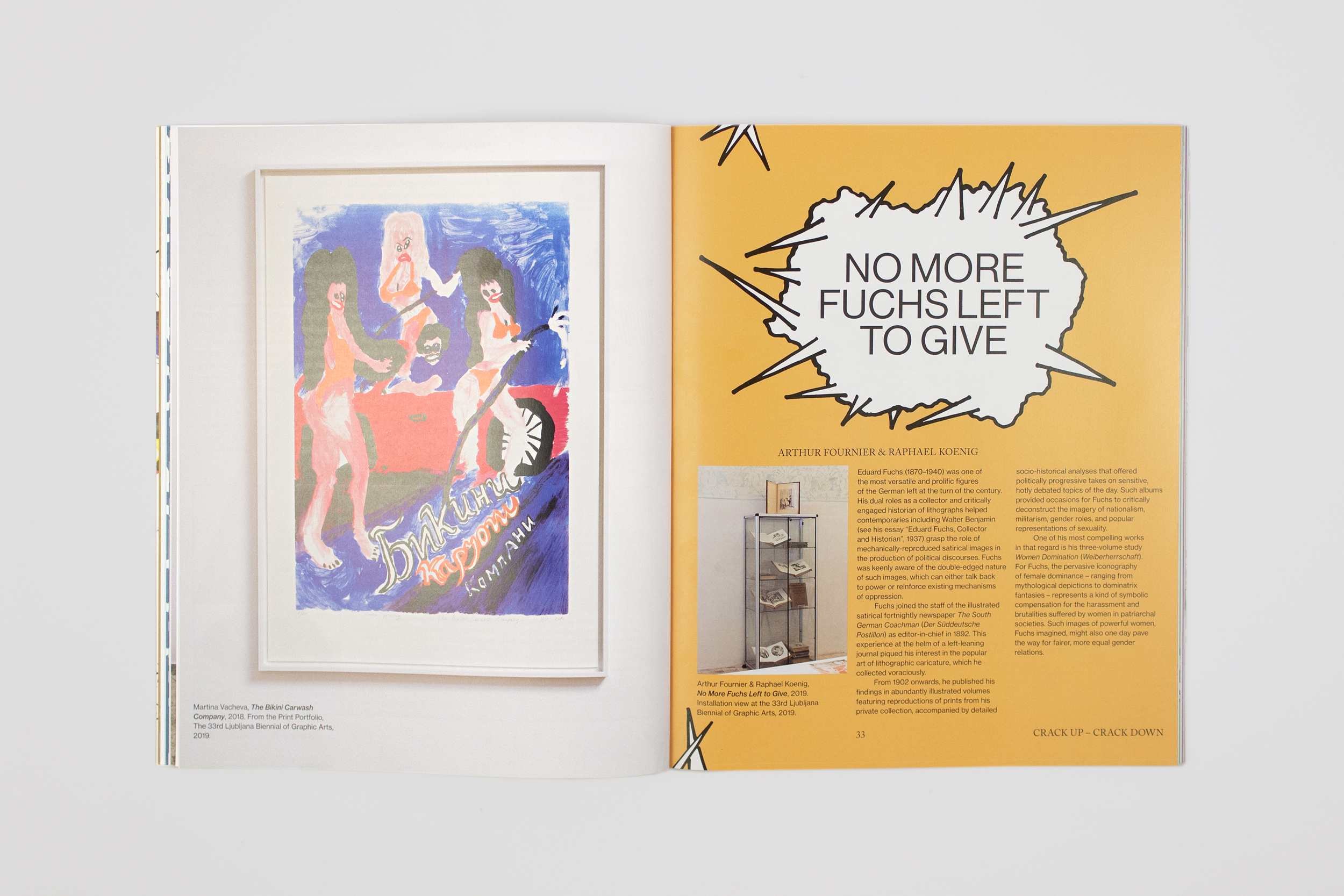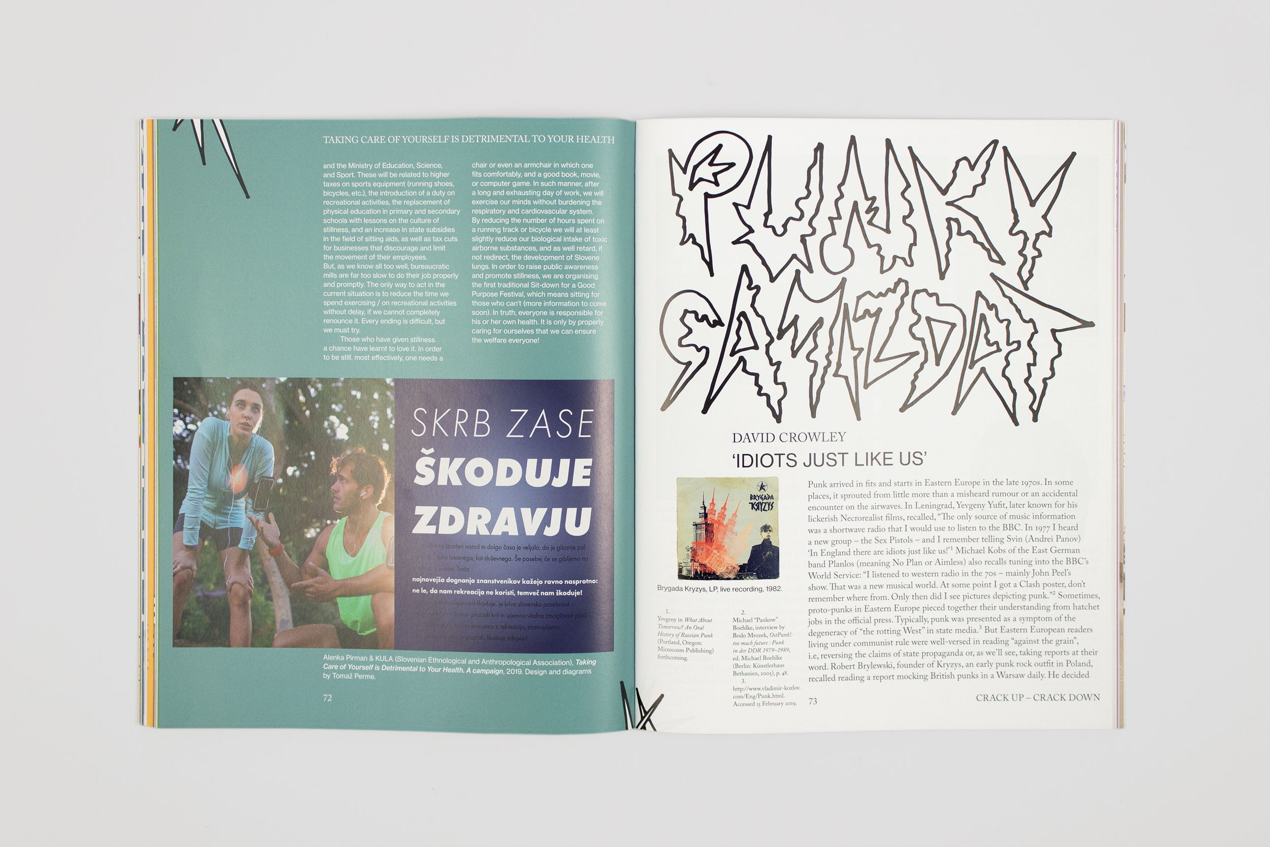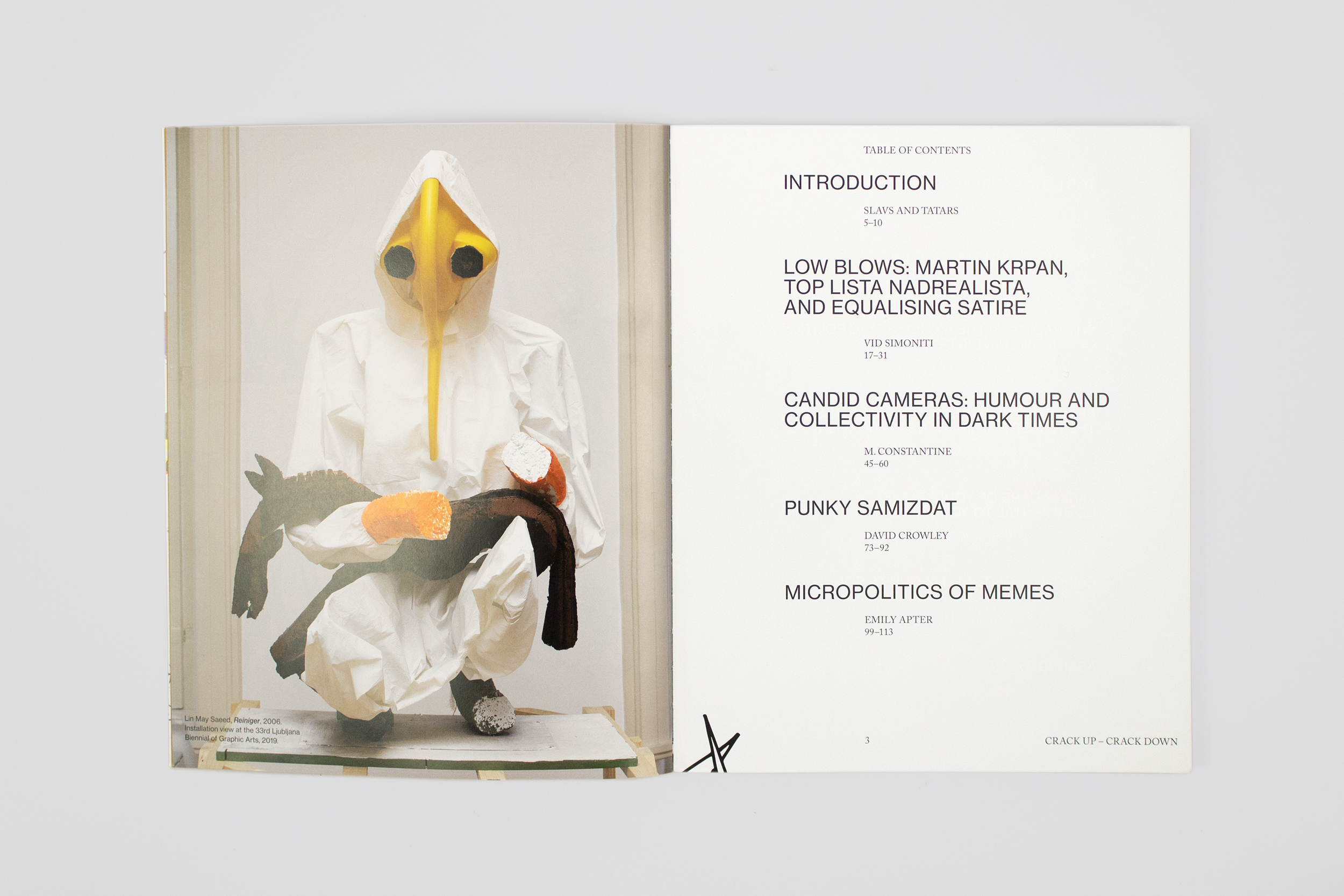 Designed by Stan de Natris (Slavs and Tatars), illustrated by Nejc Prah, and published on the occasion of the 33rd edition of the Ljubljana Biennial of Graphic Arts, CRACK UP – CRACK DOWN considers “the graphic” heritage of the Biennial not as a medium, per se, but rather as an agency and strategy. Purporting to speak truth to power, satire has proven itself to be a petri dish in a world of post-truth bacteria. Edited by Slavs and Tatars, the exhibition’s curators, CRACK UP – CRACK DOWN extends the discursive focus of the Biennial on graphics and satire: featuring commissioned essays from Emily Apter on the micropolitics of memes, David Crowley on punk as a platform of dissimulation in Poland and Hungary, Vid Simoniti on the cult Bosnian satire Top lista nadrealista, among other Balkan precedents, and Melissa Constantine on the affective infrastructures of satire with visual contributions and essays by Metahaven, Hamja Ahsan, Alenka Pirman, and others.