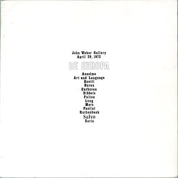 Giovanni Anselmo, Alighiero Boetti, Daniel Buren, Hanne Darboven, Jan Dibbets, Hamish Fulton, Richard Long, Mario Merz, Guilio Paolini, Reiner Ruthenbeck, Gilberto Zorio, Salvo, Art and Language