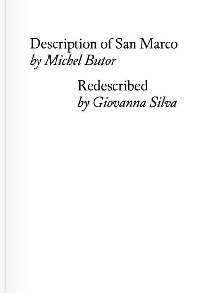 Michel Butor's Description of San Marco (1963) is an unusual book; an unorthodox intermingling of overheard dialogue from the iconic Venetian square in question, thick descriptions of persons and buildings, along with sober historical information. In the original, each genre of information is assigned a distinct typography of its own, hence interacting like voices in a play.