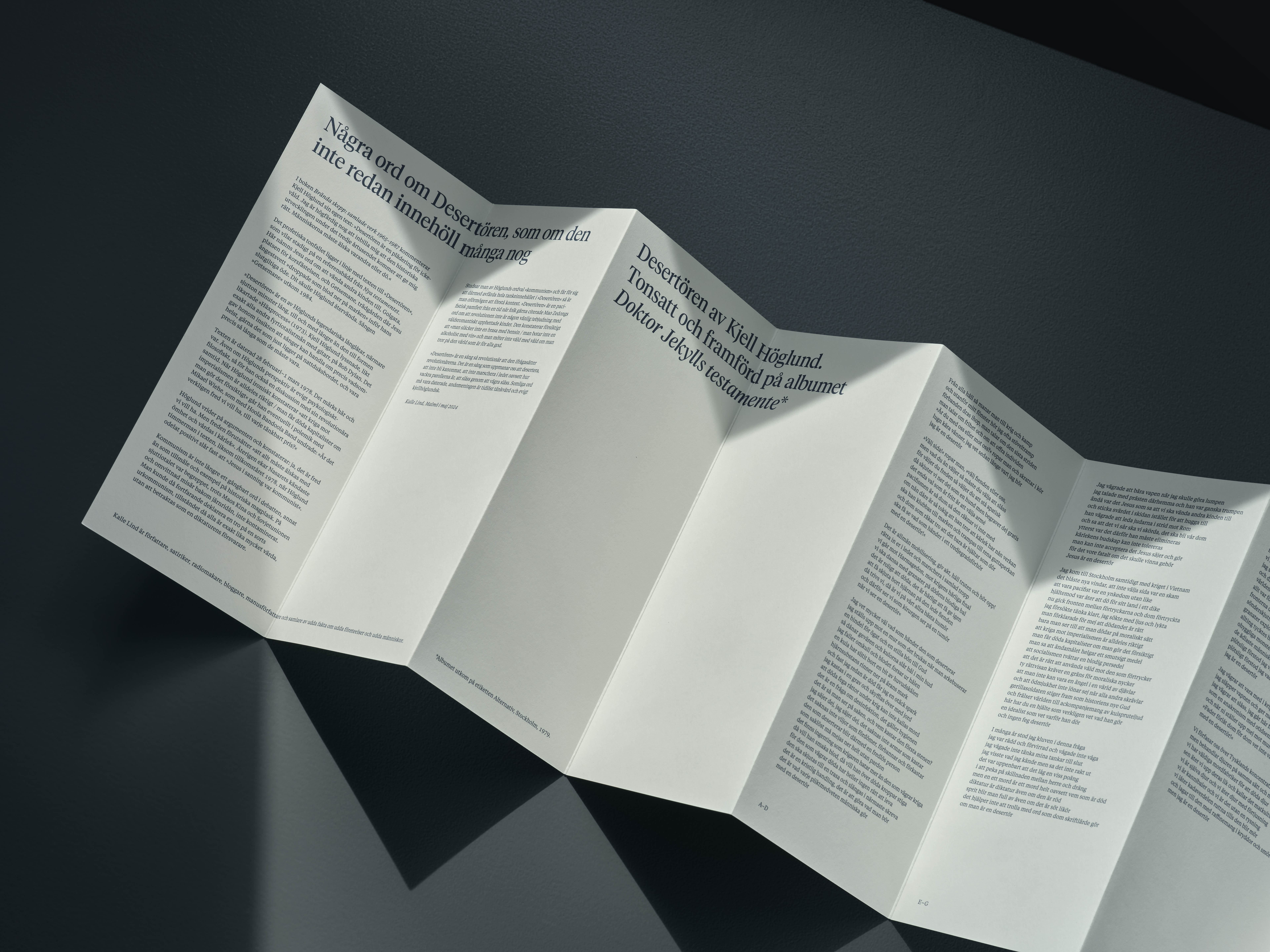 ’Desertören’ by Kjell Höglund is a concertina publication that presents, for the first time in a book, the complete lyrics to Höglund’s legendary 17-minute song ’Desertören’ (’The Deserter’). Written in 1978, the song quickly became a pacifist anthem, especially among the politically left-leaning youth of the time.
