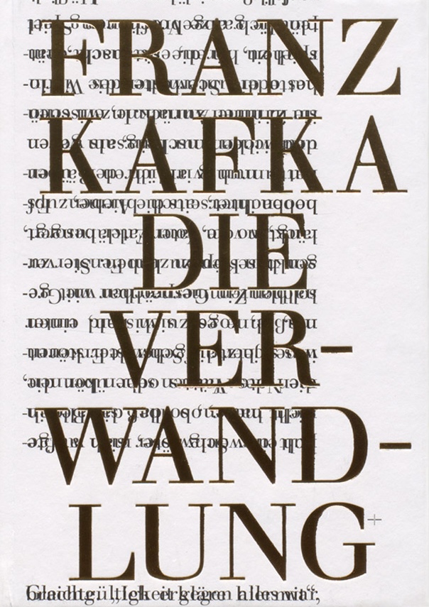 Von Kafka sind auf seinen ausdrücklichen Wunsch zwei Bücher in der 16 Punkt grossen Walbaum-Schrift erschienen: Betrachtung (1908) und Ein Landarzt (1920). Mit dem Satzspiegel von Die Verwandlung war er gar nicht zufrieden («dunkles und gedrängtes Seitenbild»). Wir haben diesen Wahnsinnstext jetzt in der 16p Walbaum auf zeitgenössische Weise umgesetzt – das Lesevergnügen wird in einem gewissen Sinne ins Delirierende gesteigert, wie z.B. Blade Runner im Grossleinwand-Kino.