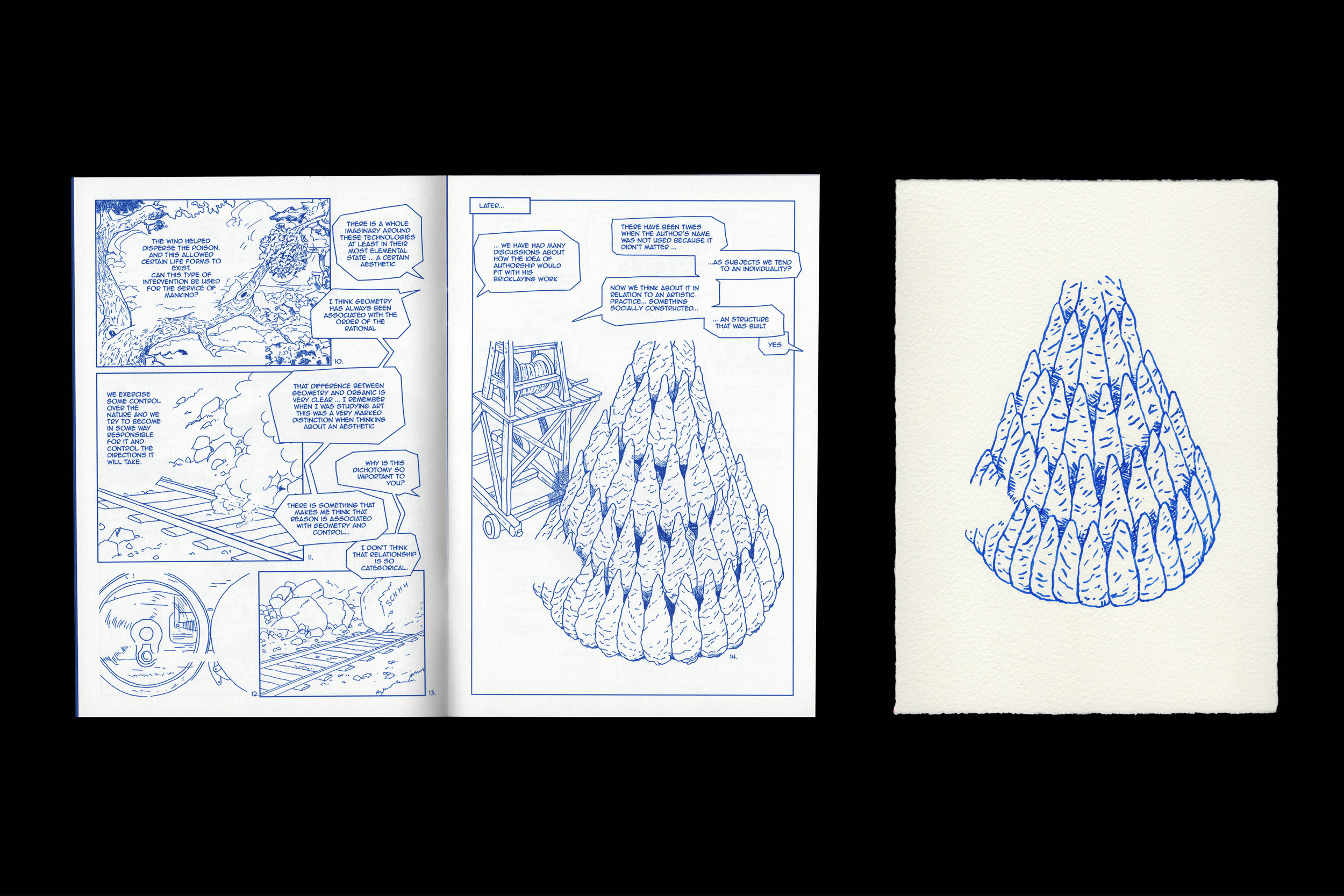 “Distance” is a conceptual comic by Raúl Silva, produced in collaboration with Paula Eslava. The work features panels appropriated from various manga and comic sources, overlaid with original dialogue that explores abstract concepts like the dichotomy between the geometric and oceanic, rationality versus impulse, authorship, and the relationship between the spiritual and physical realms. Through this juxtaposition of borrowed visuals and new text, the artists create a contemplative meditation on human experience, creative expression, and philosophical dualities.
