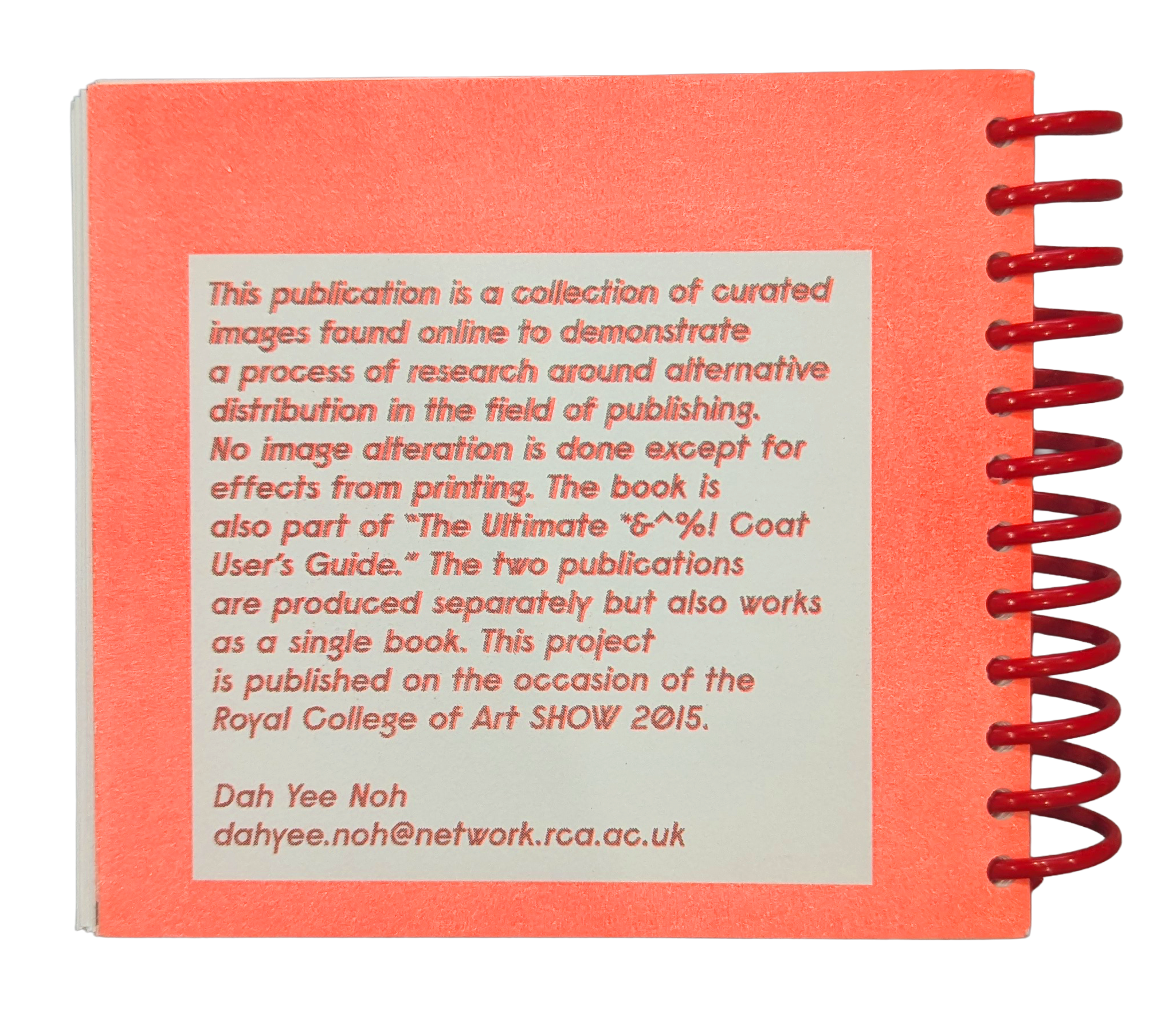 This publication is a collection of curated images found online to demonstrate a process of research around alternative distribution in the field of publishing. No image alteration is done except for effects from printing. The book is also part of "The Ultimate "&^%/ Coat User's Guide." The two publications are produced separately but also works as a single book. This project is published on the occasion of the Royal College of Art SHOW 2015.