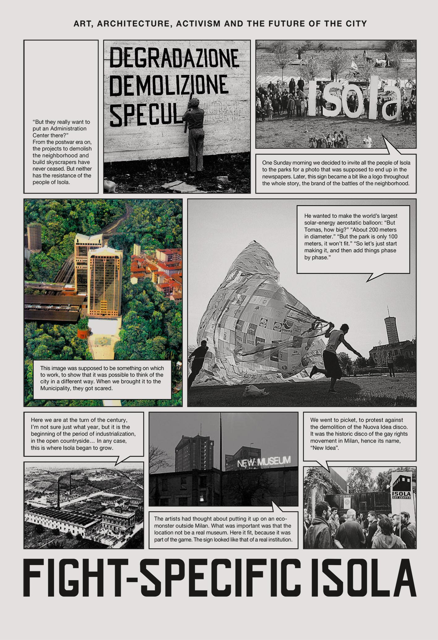 Fight-Specific Isola traces the long history of the Isola area of Milan and the organic, spontaneous progress of the Isola Art Center over the past 12 years. Featuring texts and many images, the book tells the story of an artistic and urban transformation, led by artists, who often had to invent tools and concepts along the way. This publication serves as an example of how to act on the ground in today’s urban condition. Different narratives of history, artistic intervention and action allow the reader to trace the complex idea of collectivity, solidarity and fight-specificity. Testing new terms such as dirty cube and dispersed center this book shows a possible way to respond to the constant pressure of neoliberal development and gentrification.
