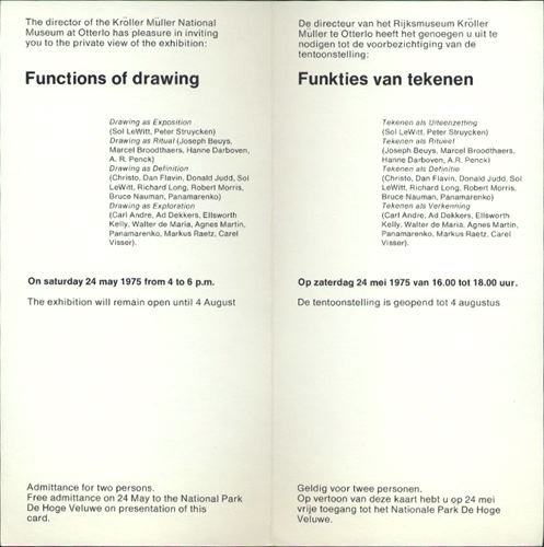 Group show with works by Joseph Beuys, Bruce Nauman, Marcel Broodthaers, Richard Long, Markus Raetz, Walter De Maria, Sol Lewitt, Brice Marden, Cy Twombly, Carel Visser, A.R. Penck, Donald Judd, Carl Andre, Robert Morris, Hanne Darboven, Ad Dekkers, Peter Struycken, Dan Flavin, Panamarenko, Agnes Martin, Ellsworth Kelly