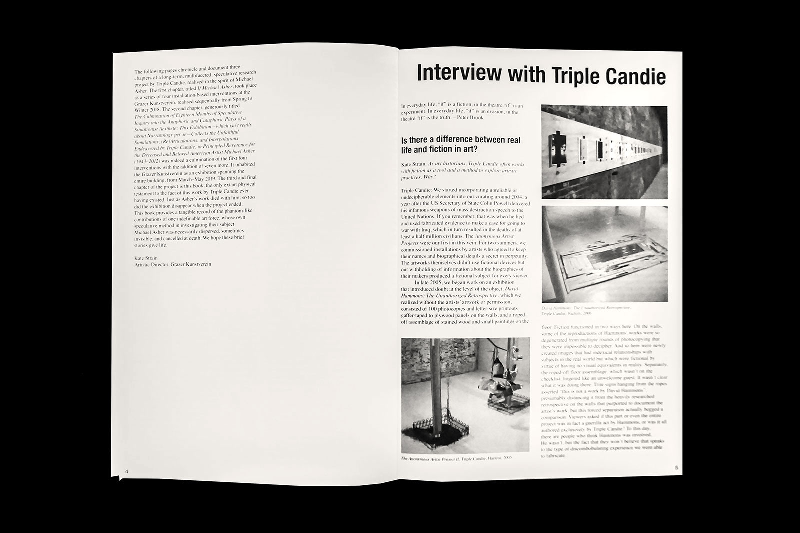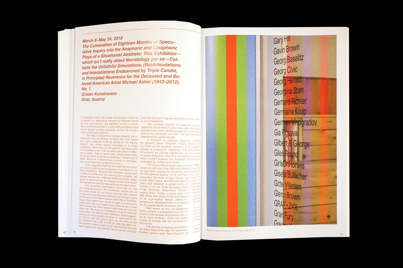 In 2017 Triple Candie (Shelly Bancroft and Peter Nesbett) began a multi-layered research project, investigating the work and methodologies of American artist Michael Asher (1943–2012). This performative project attempted to resurrect the lost experiential potentialities of Asher’s situational artworks, drawing on a depth of research to create new interventions in a new context, that of the institutional framework of the Grazer Kunstverein. The resulting propositions, speculations, interventions, and installations are documented in this new publication. This catalogue is published in collaboration with Phileas – A fund for Contemporary Art.
