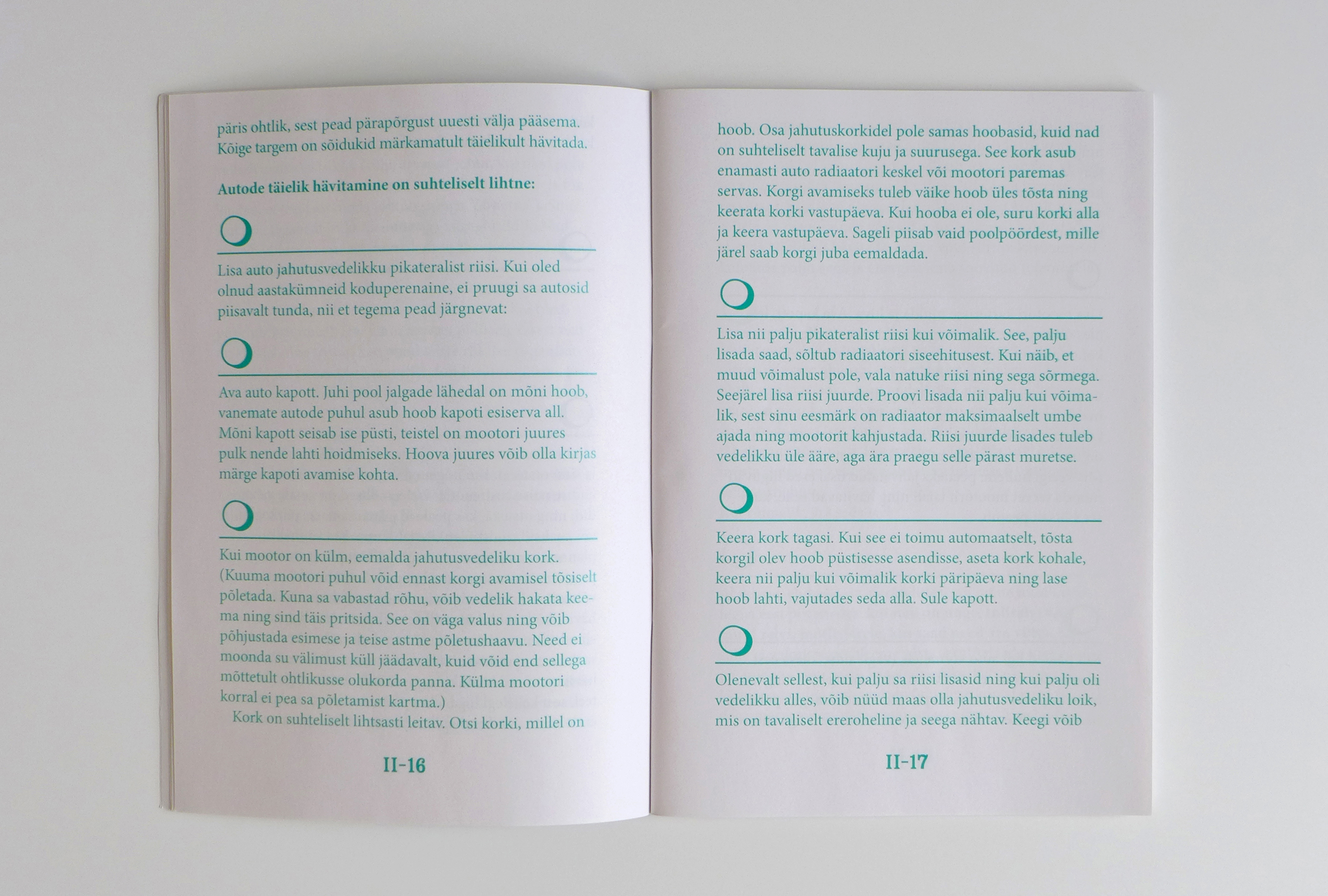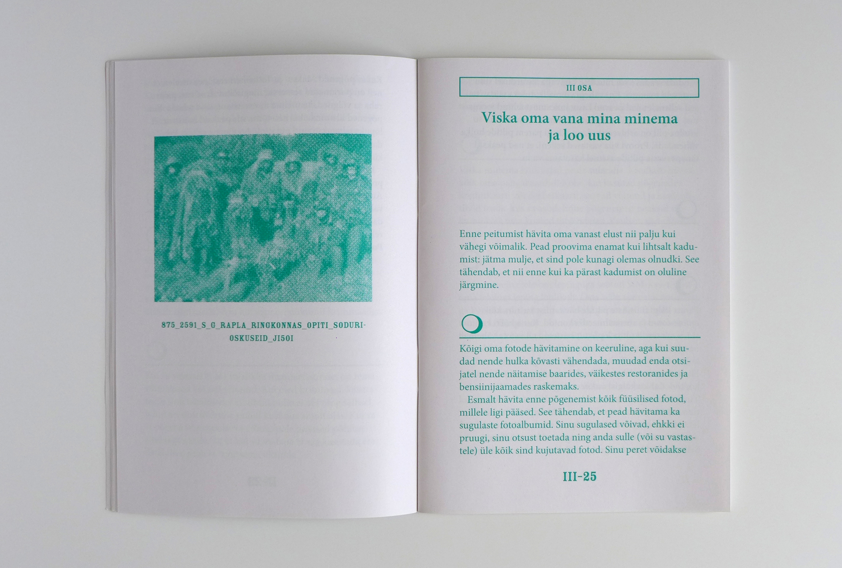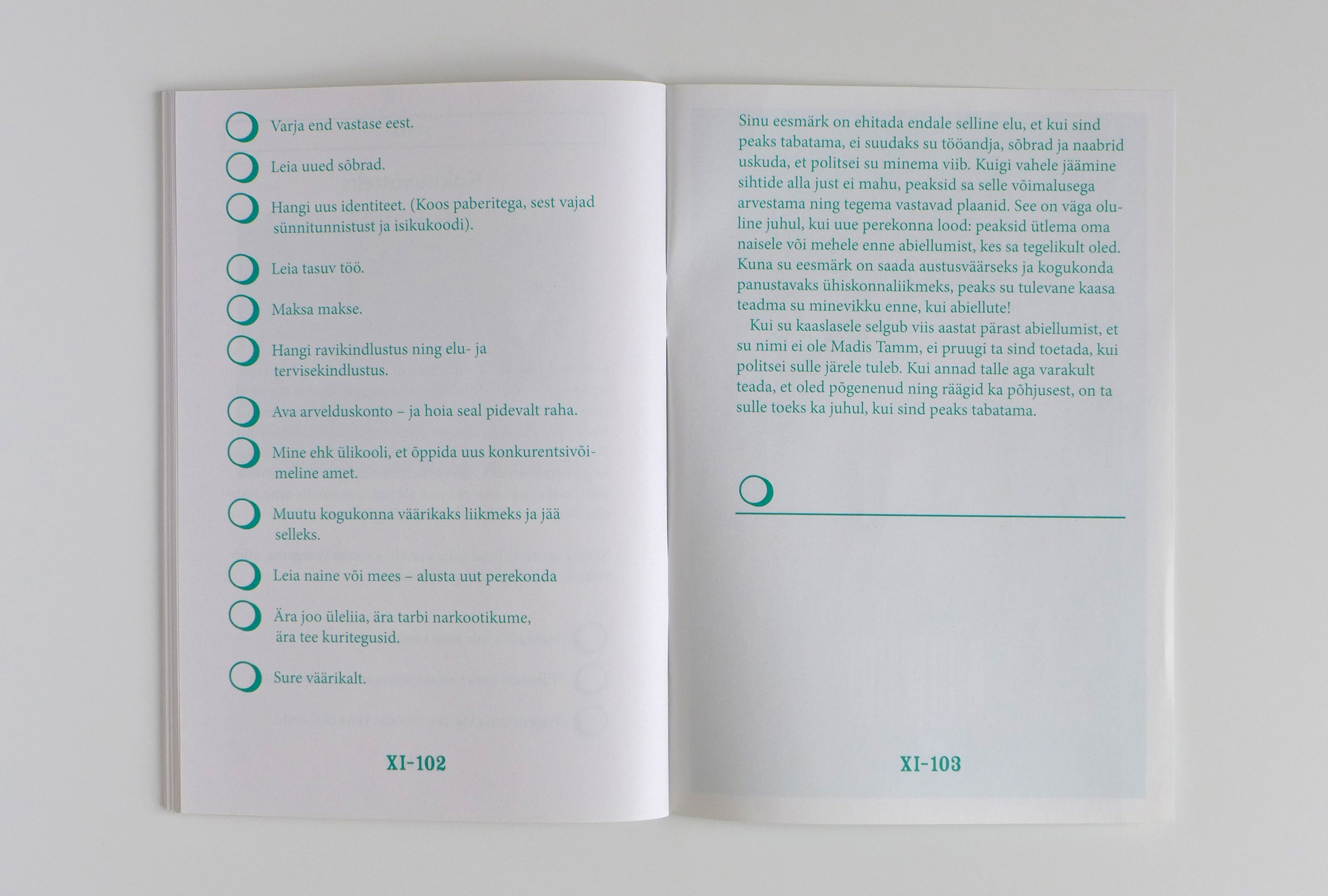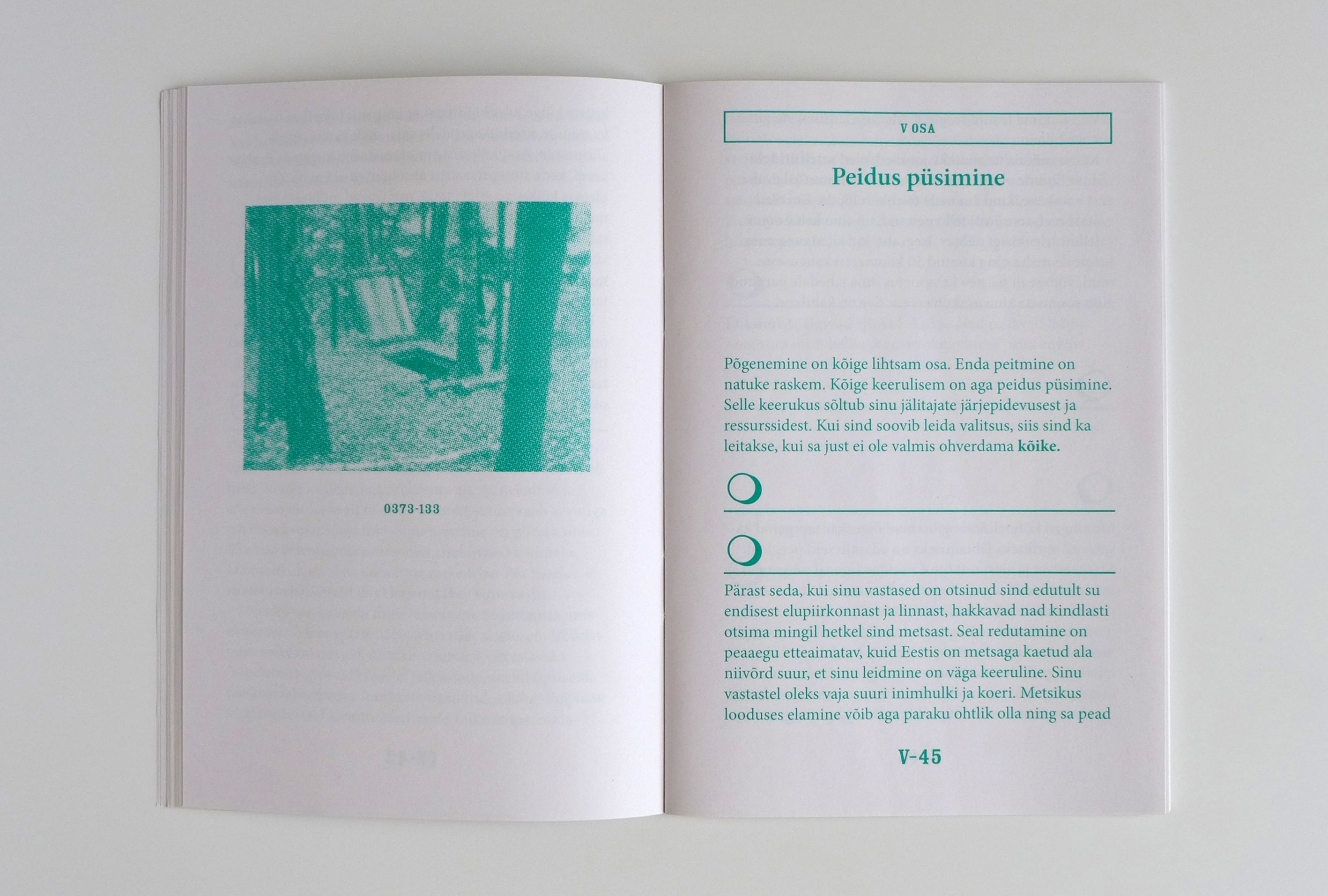 The publication is a manual on how to disappear in Estonia. Various possibilities are proposed, some of which more real, some more fantastic. A special chapter is dedicated on how to survive in the Estonian woods.