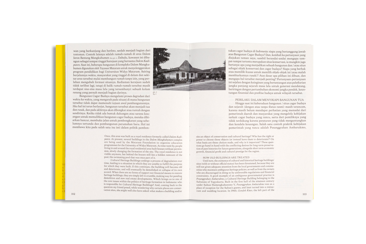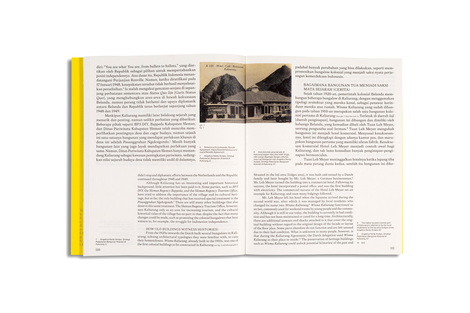 What Bungalows Can Tell is the result of extensive artistic and architectural research on the village of Kaliurang (Yogyakarta region, Indonesia). This publication brings together different essays and a series of photographs that critically explore the spatial, transformative effects of globalisation and heritage formation on a local scale. It looks specifically at the colonial bungalows —what can they tell?— and the stories around them, questioning how they were used in the past, what their function is in the present and what they can represent in the future. In doing so, this publication intends to take into account the colonial history of the village and, at the same time, bring to the fore the voices, stories and local wisdoms often eclipsed by more prominent forms of Western knowledge production.