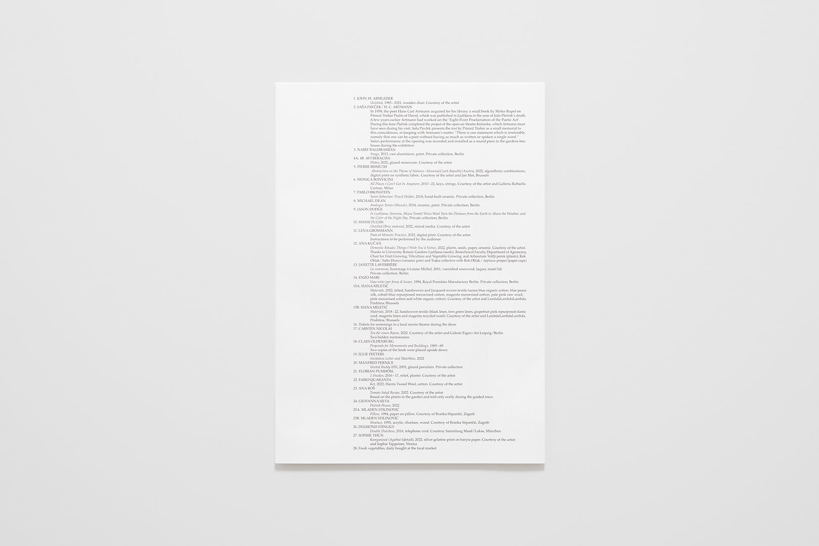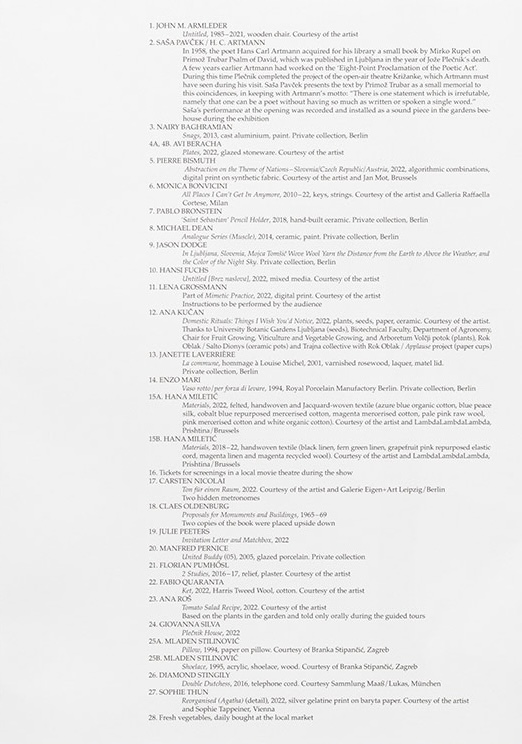 On occasion of the 150th anniversary of the birth of Jože Plečnik (1872–1957), a key figure of the Modernist movement in architecture and creator of numerous buildings and monuments around the city of Ljubljana, in 2022 Luca Lo Pinto and Olaf Nicolai curated an exhibition titled I Am Only the Housekeeper, but I Don’t Know… in the Slovenian architect’s former home. The publication retraces the contemporary interventions undertaken by the curatorial duo, who invited twenty-five internationally recognised Slovenian and foreign artists, allowing them to enter the house through their own works to commemorate Plečnik’s oeuvre and place its reading into a different and more contemporary context. Drawing inspiration from a fictionalised letter ascribed to Urška, Plečnik’s hypothetical governess, the exhibition creates new perspectives within the house and accepts that “things can be a certain way, and that they can also be different,” as stated in Urška’s letter.