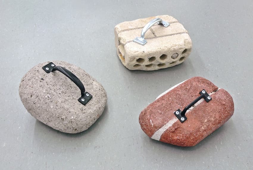 "Water eroded rubble from the Leslie Street Spit - a dumping ground for sand, broken bricks, cinder blocks and earth dredged from construction projects across the city - is scavenged and converted into equipment for ballistic exercises. In between weight-lifting sessions they serve as attractive floor sculptures." (Nothing Else Press)