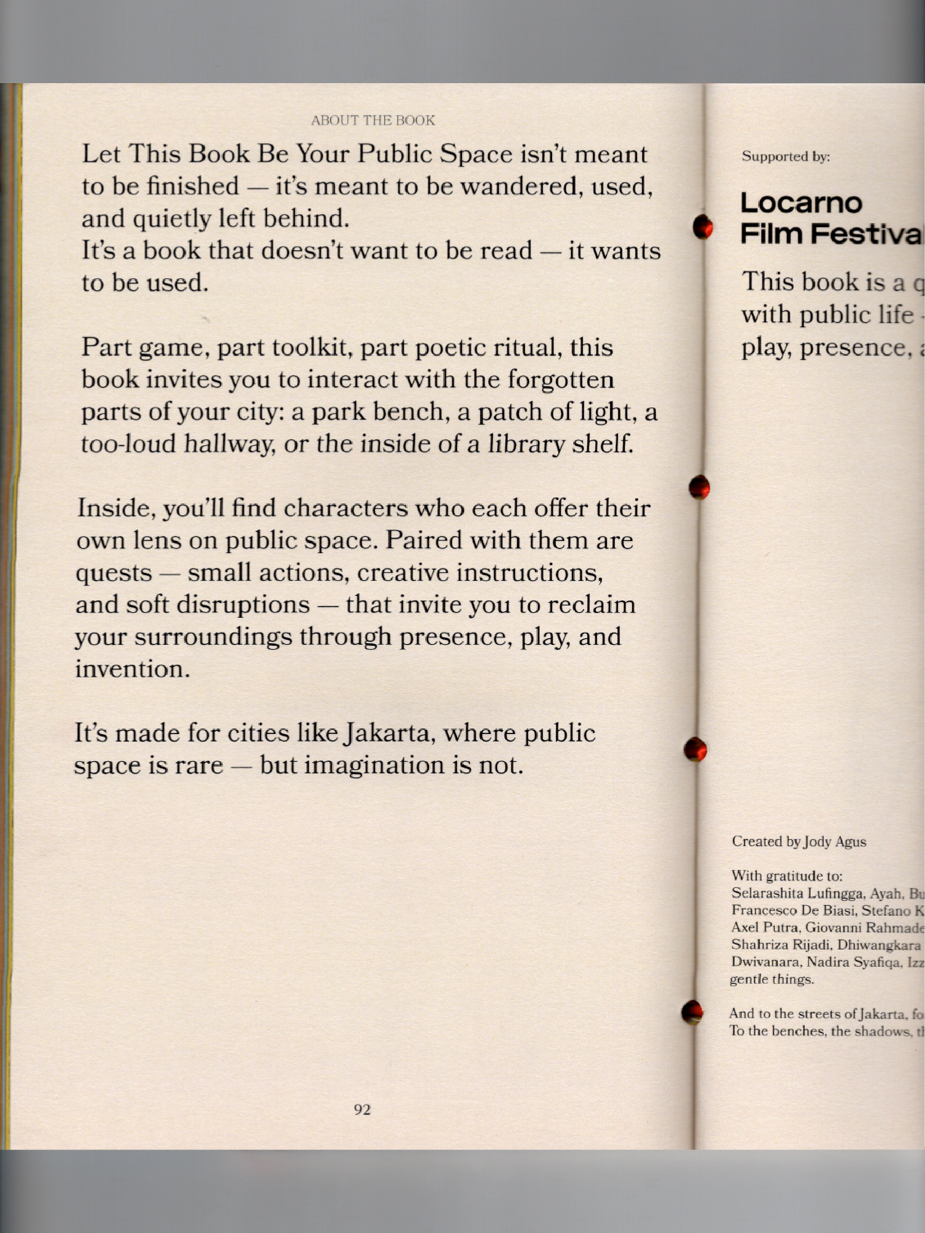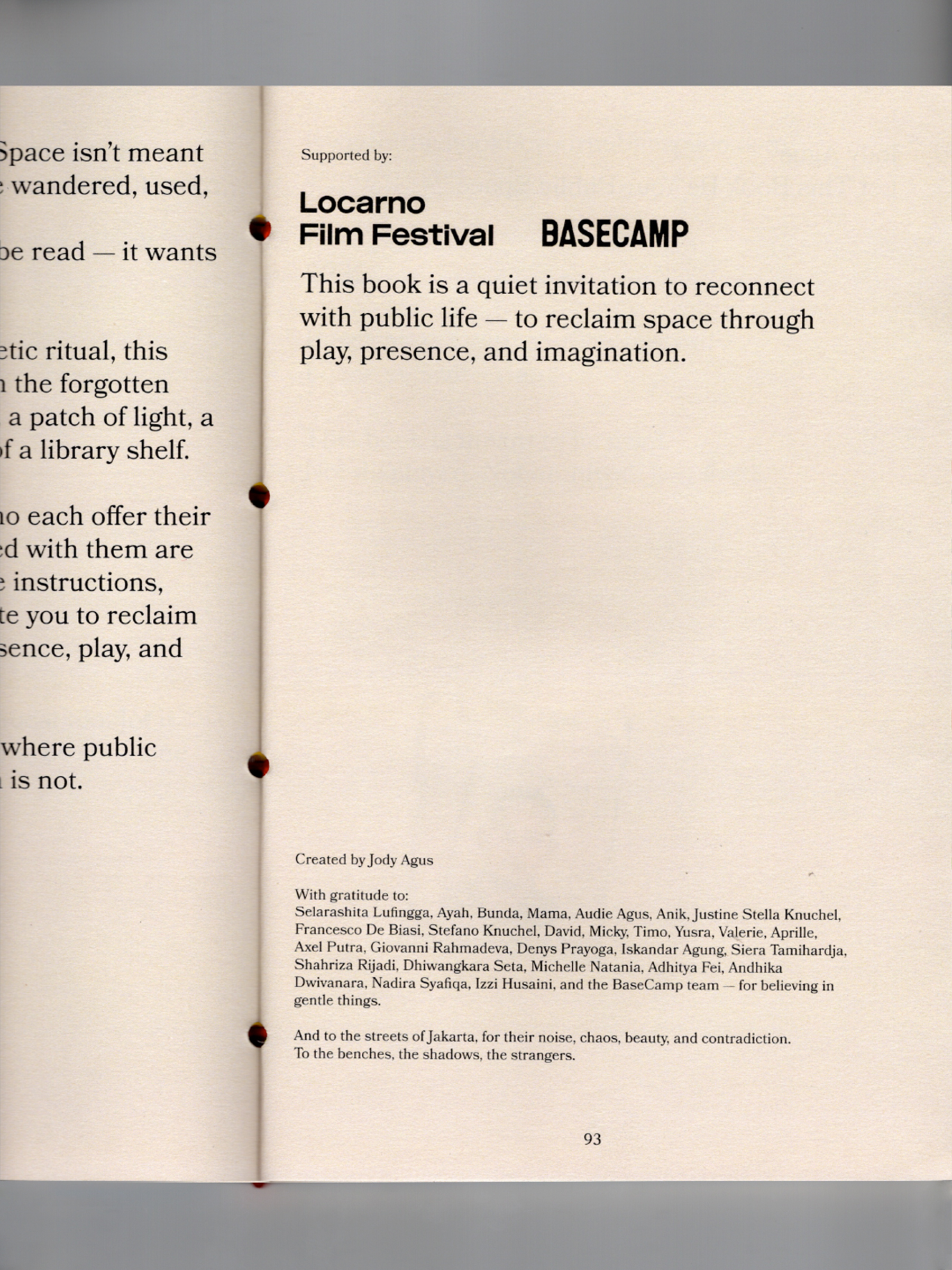 A poetic field guide and artistic promptbook designed to activate imagination in cities where public space is scarce—especially Jakarta. Mixing illustration, text, photography, and game-like quests, it invites readers to perform soft interventions in their urban surroundings, reclaim overlooked places, and contribute to a collective story of presence. The book emerged from a year-long research and design process supported by Locarno Film Festival’s BaseCamp 2025. It’s part publication, part experiment, and part invitation to reimagine what public life could feel like. A visual and spatial reflection on Jakarta’s urban condition, echoing collective public art, field notebooks, and poetic social design.