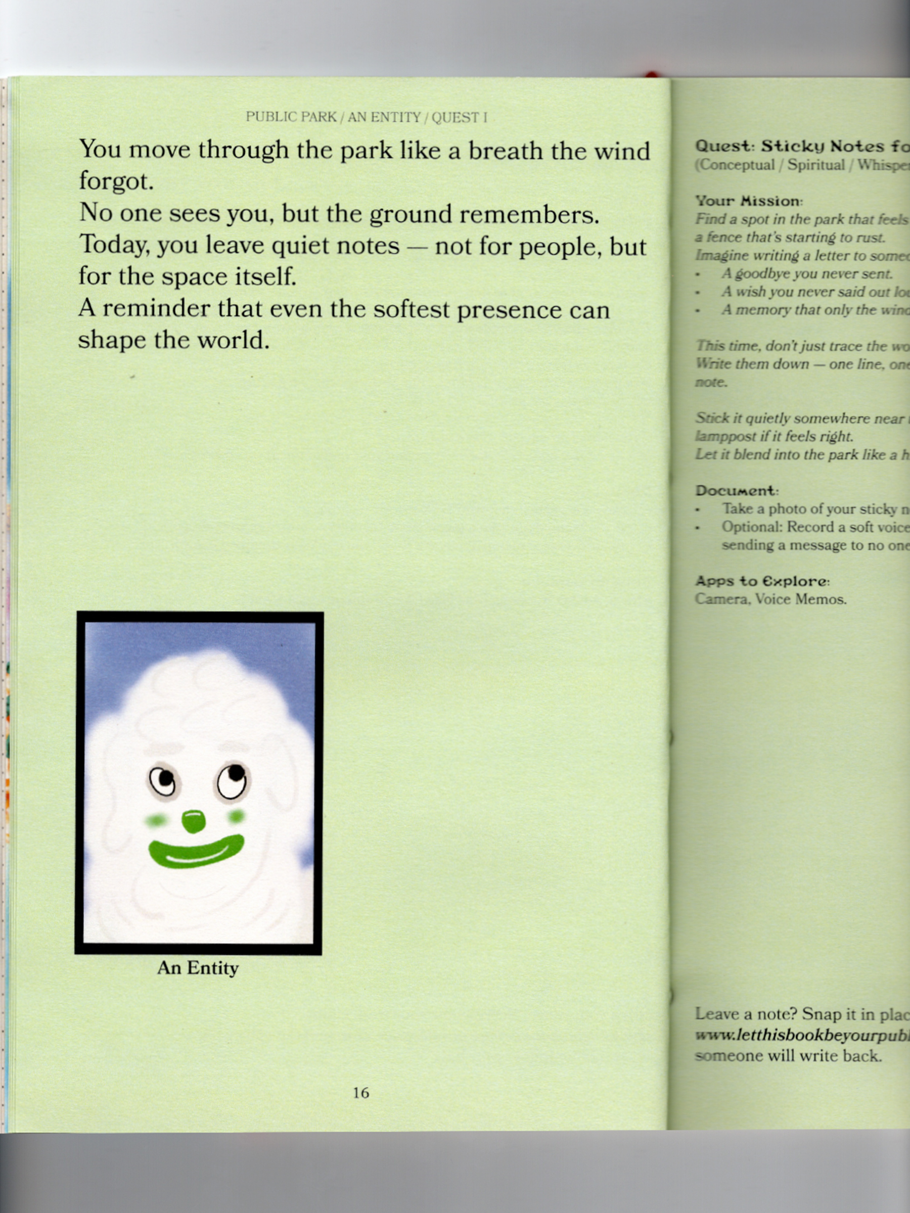 It’s a book that doesn’t want to be read — it wants to be used. Part game, part toolkit, part poetic ritual, this book invites you to interact with the forgotten parts of your city: a park bench, a patch of light, a too-loud hallway, or the inside of a library shelf.