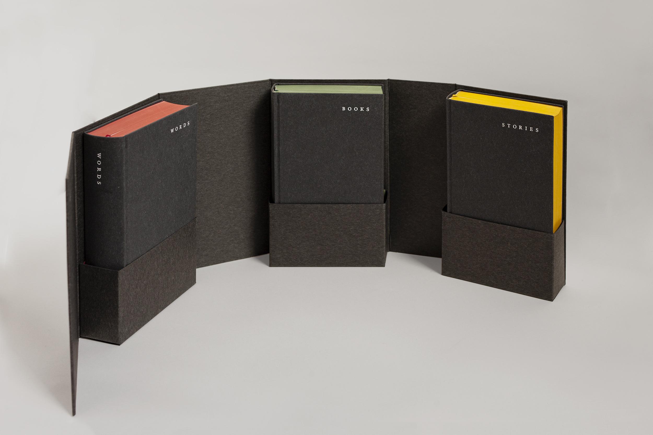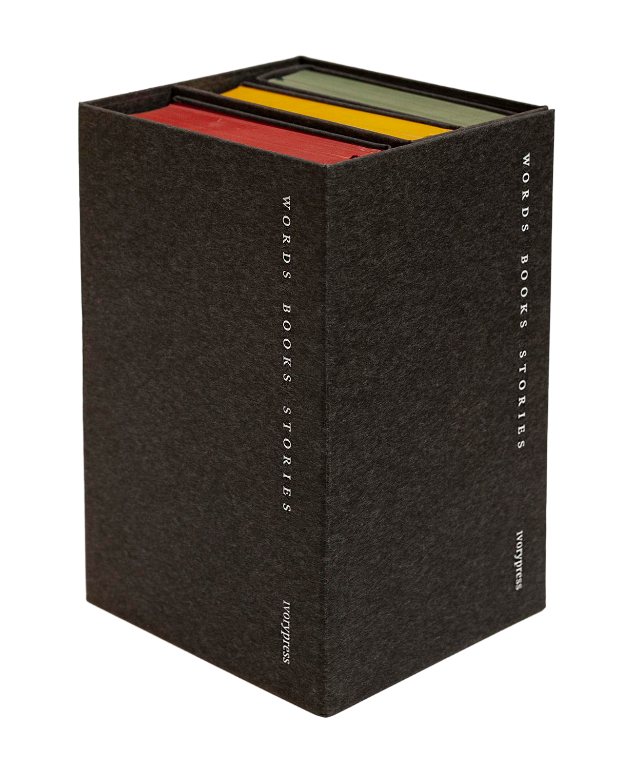 The special edition box set of Looking Forward: Ivorypress at Twenty-Five has been conceived as a pack to house the three books. It includes an open top through which the coloured edges can be seen and unfolds into a display device once opened. The books can also be acquired separately.