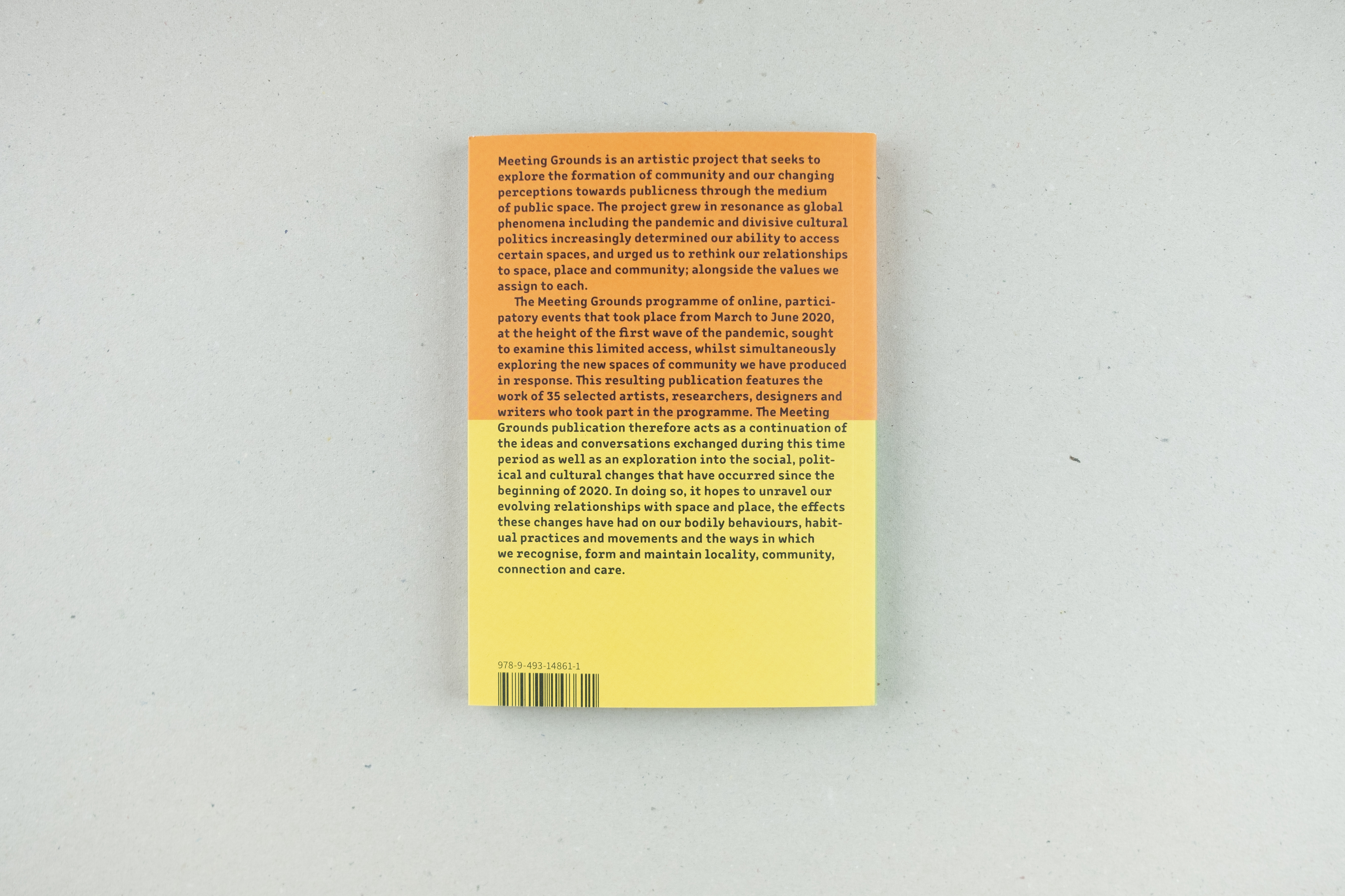 The Meeting Grounds programme of online, participatory events that took place from March to June 2020, at the height of the first wave of the pandemic, sought to examine this limited access, whilst simultaneously exploring the new spaces of community we have produced in response. This resulting publication features the work of 35 selected artists, researchers, designers and writers who took part in the programme. The Meeting Grounds publication therefore acts as a continuation of the ideas and conversations exchanged during this time period as well as an exploration into the social, political and cultural changes that have occurred since the beginning of 2020. In doing so, it hopes to unravel our evolving relationships with space and place, the effects these changes have had on our bodily behaviours, habitual practices and movements and the ways in which we recognise, form and maintain locality, community, connection and care.