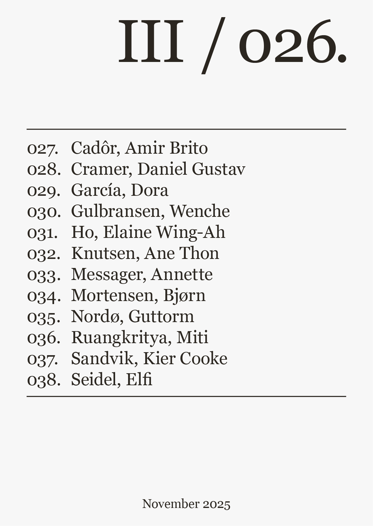 Amir Brito Cador, Daniel Gustav Cramer, Dora García, Wenche Gulbransen, Elaine Wing-Ah Ho, Ane Thon Knutsen, Annette Messager, Bjørn Mortensen, Guttorm Nordø, Miti Ruangkritya, Kier Cooke Sandvik, Elfi Seidel