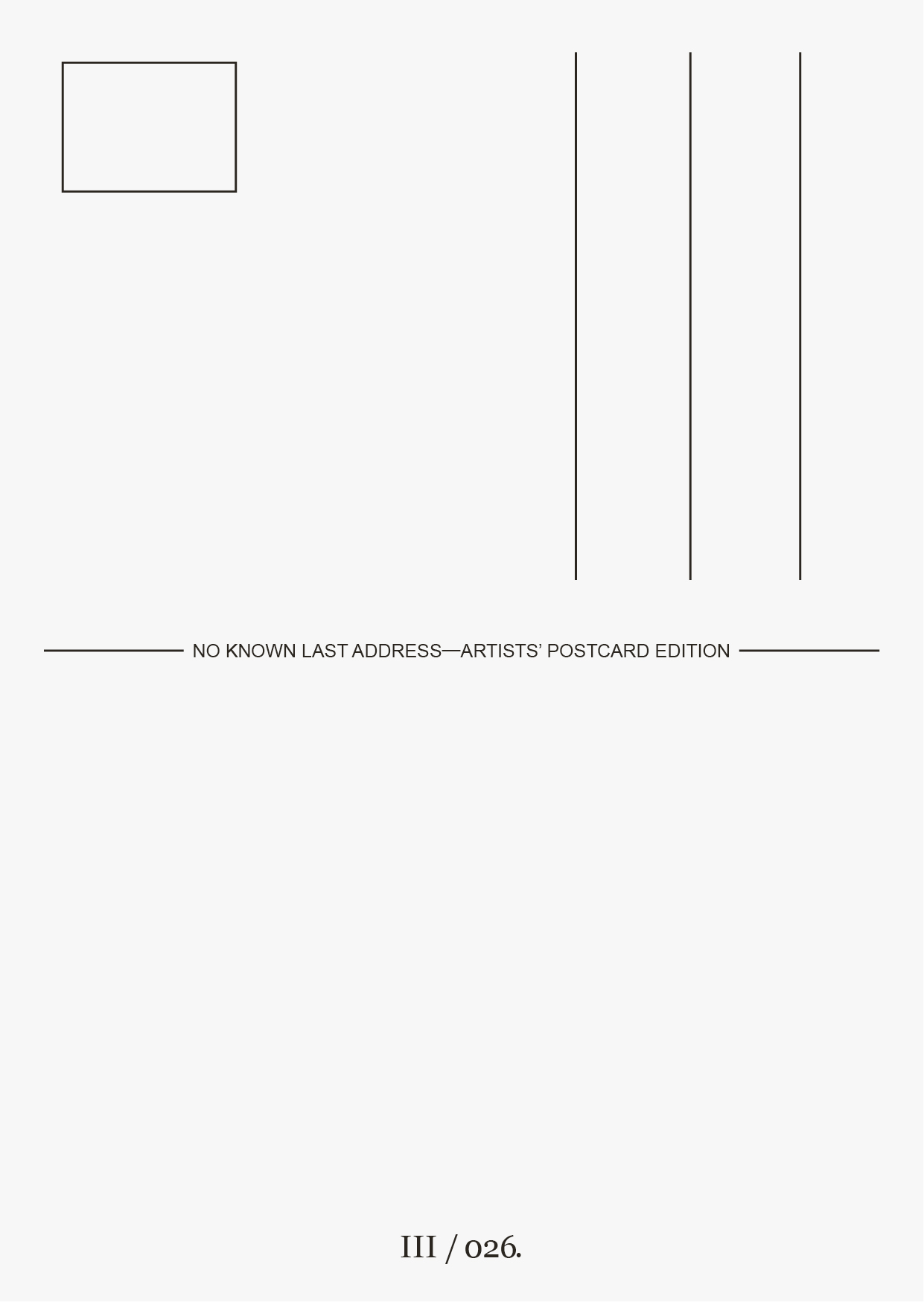 | Series | No Known Last Address—Artists’ Postcard Edition, III / 026.–038. |