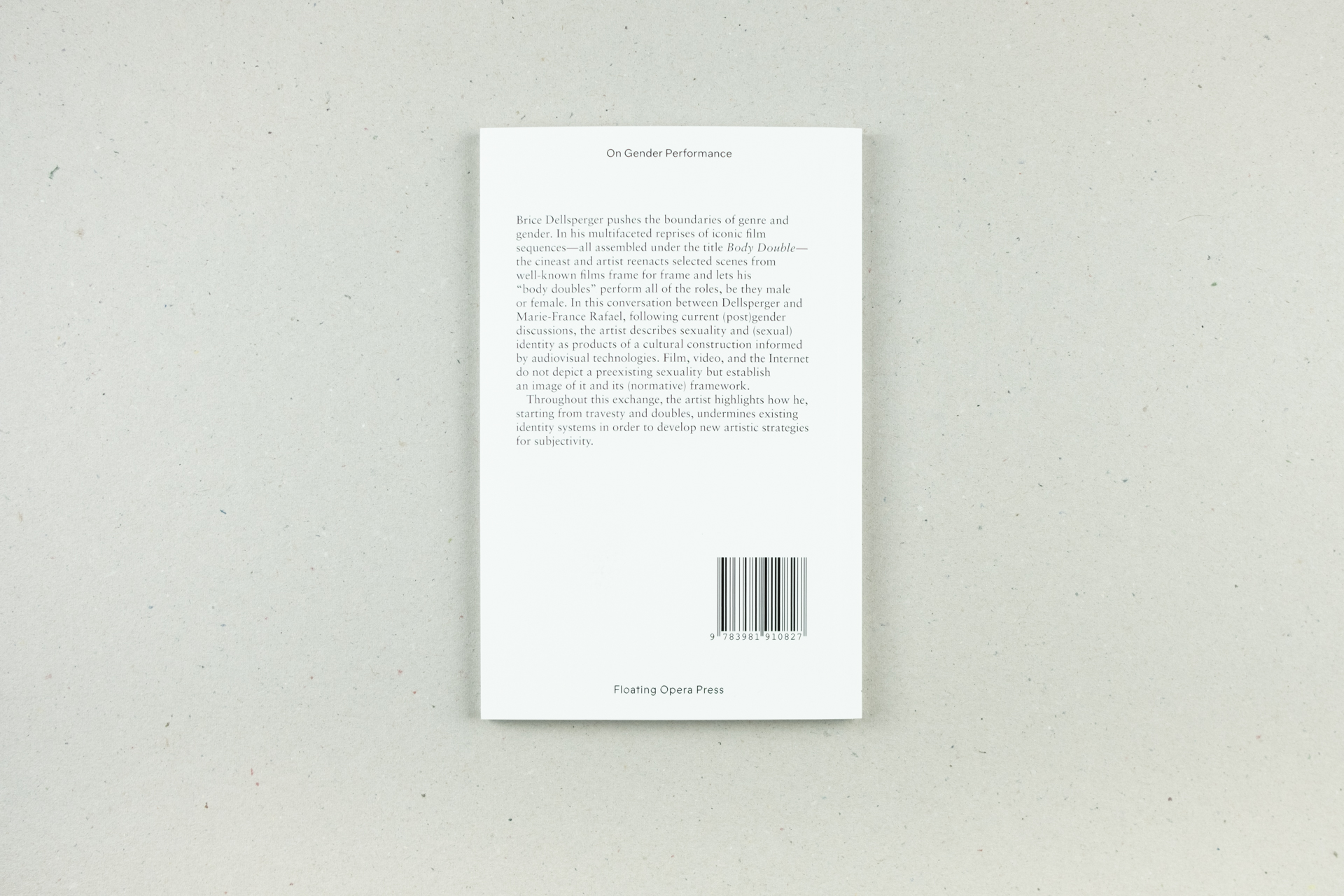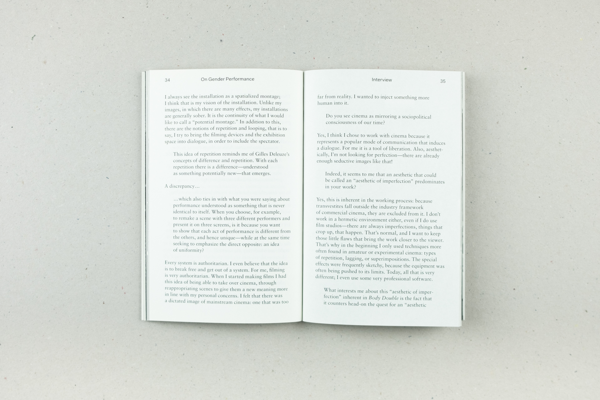 In this conversation between Dellsperger and Marie-France Rafael, following current (post-)gender discussions, the artist describes sexuality and (sexual) identity as products of a cultural construction informed by audiovisual technologies. Film, video, and the Internet do not depict a pre-existing sexuality but establish an image of it and its (normative) framework. Throughout this exchange, the artist highlights how he, starting from travesty and doubles, undermines existing identity systems in order to develop new artistic strategies for subjectivity.