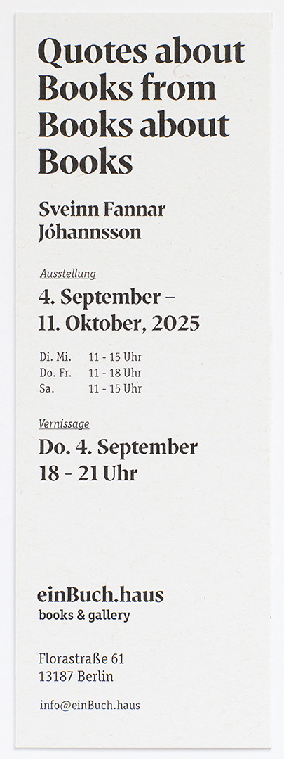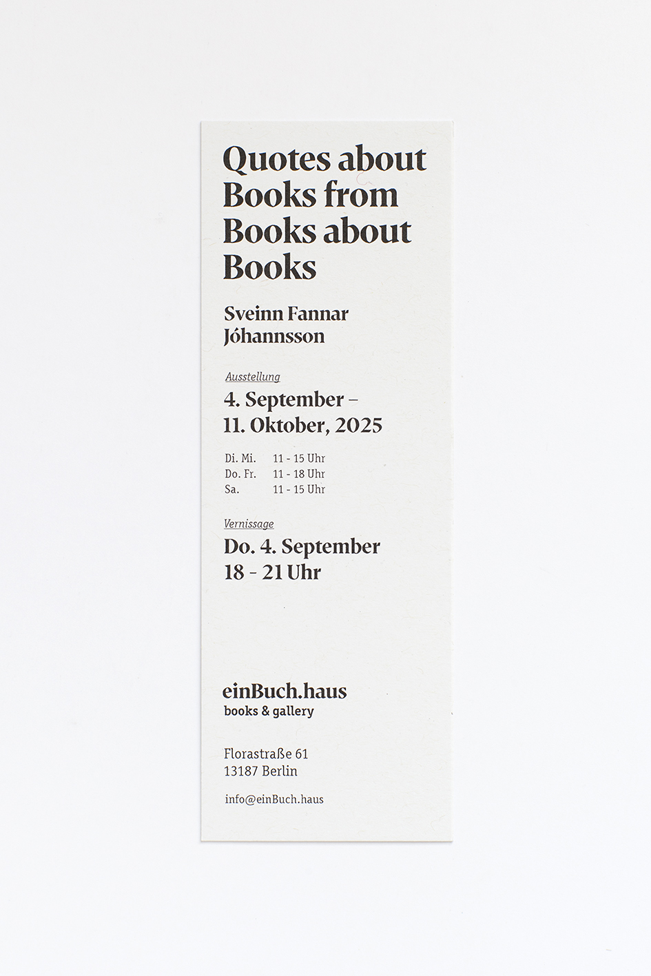 Published in conjunction with the exhibition «Quotes about Books from Books about Books», at einBuch.haus in Berlin, 4. September–11. Oktober, 2025-
