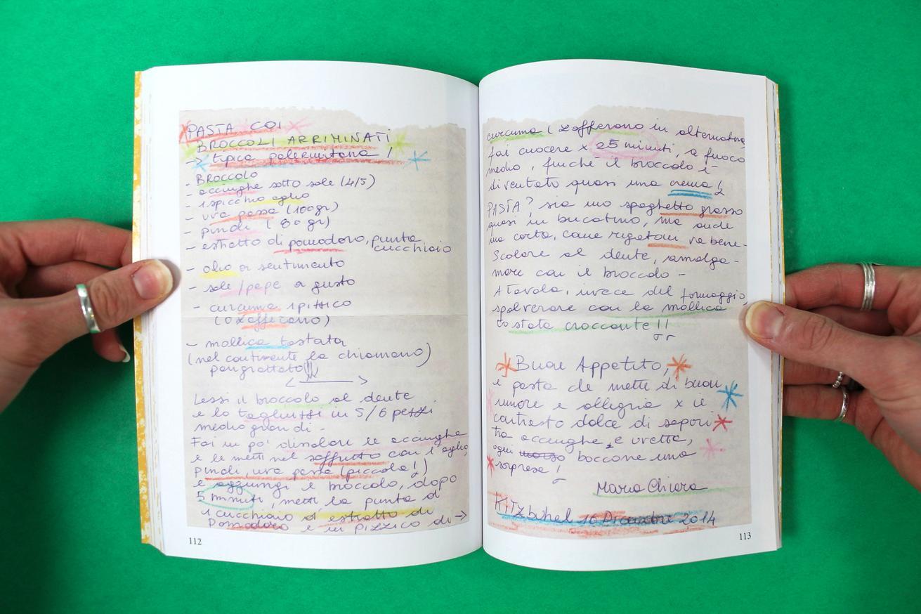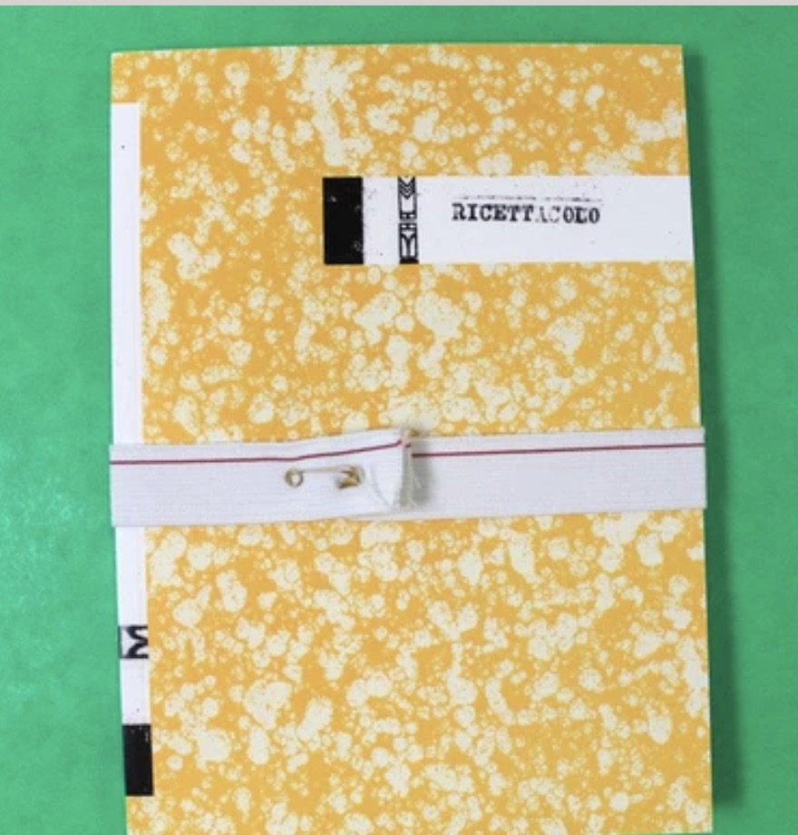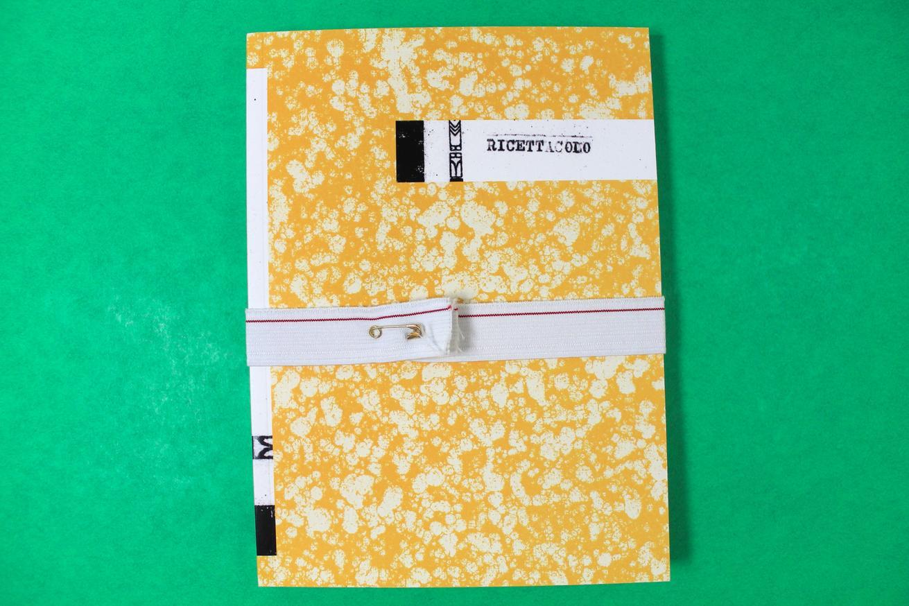 This bound, paper-back book contains several recipes for Italian dishes, handwritten and photographed in situ with the paper and personal artifacts that relate to them. Ricettacolo represents the transition of a personal book to a reproducible one; there are some instances at the end of the publication where its theme swerves slightly and becomes reflective of the author’s residence in Brooklyn through photographs, New York-centric recipes and collages of personal images. A jovial print and title along the side of the book suggests a kinship to commercial cook books. An elastic band is used to wrap around the book, held together by a single gold safety pin. Ricettacolo is a playful reference to a family’s cooking secrets in a monetized instructional cooking context.