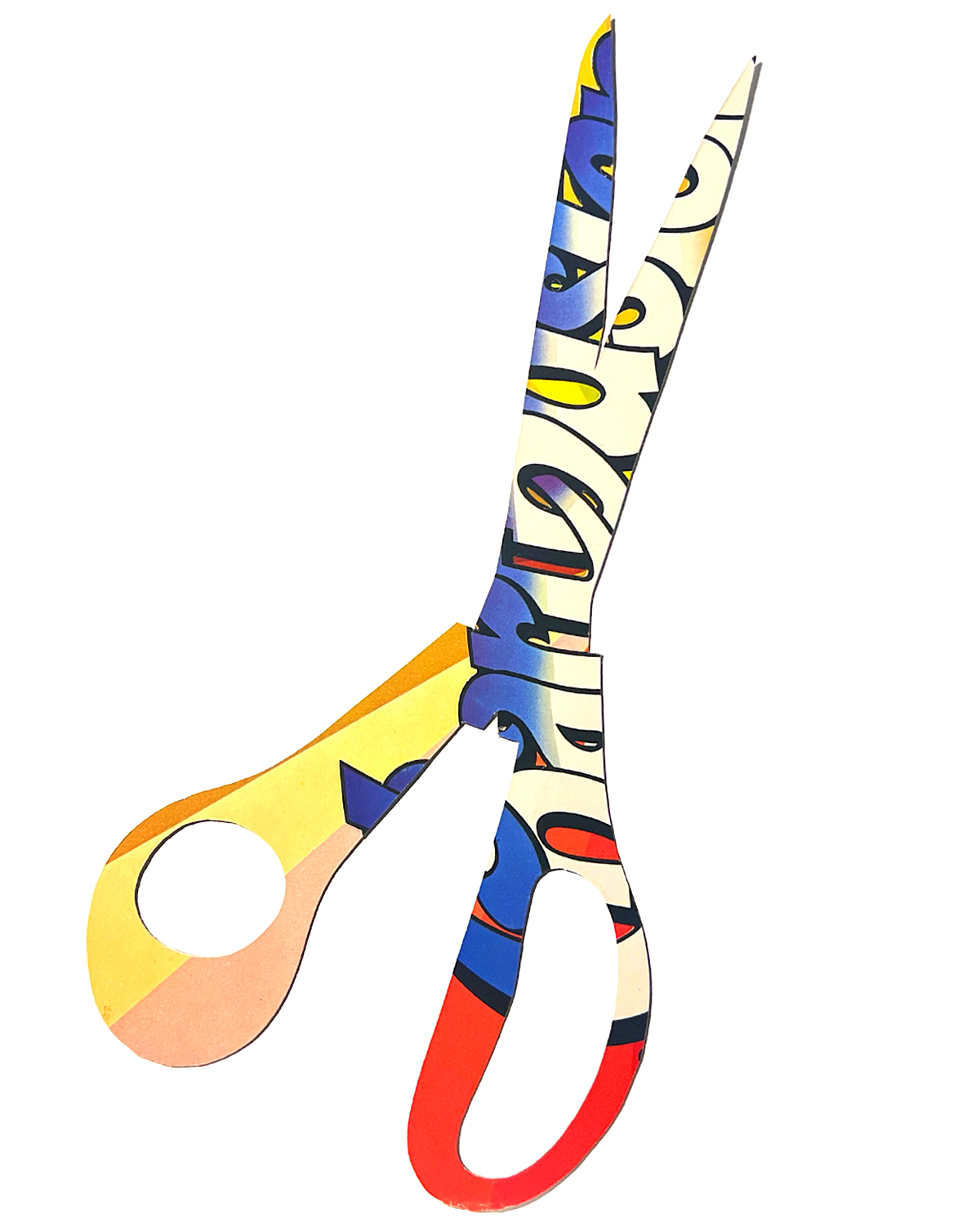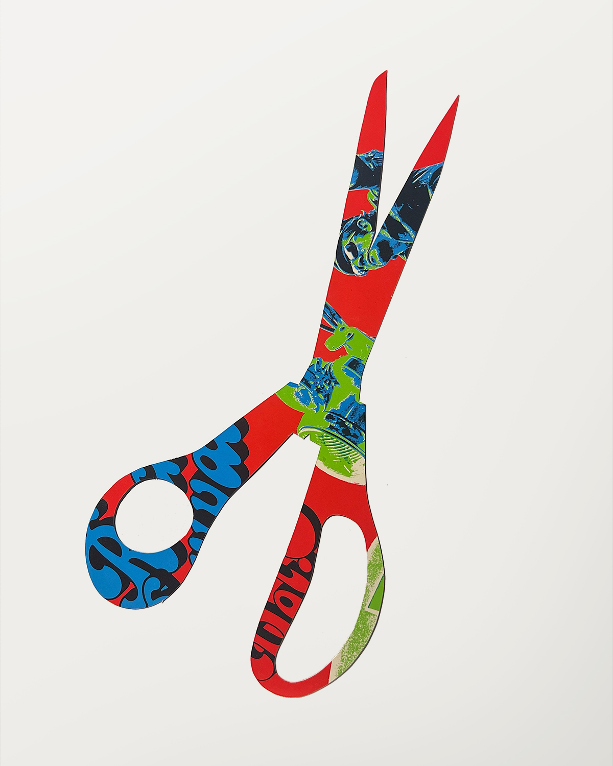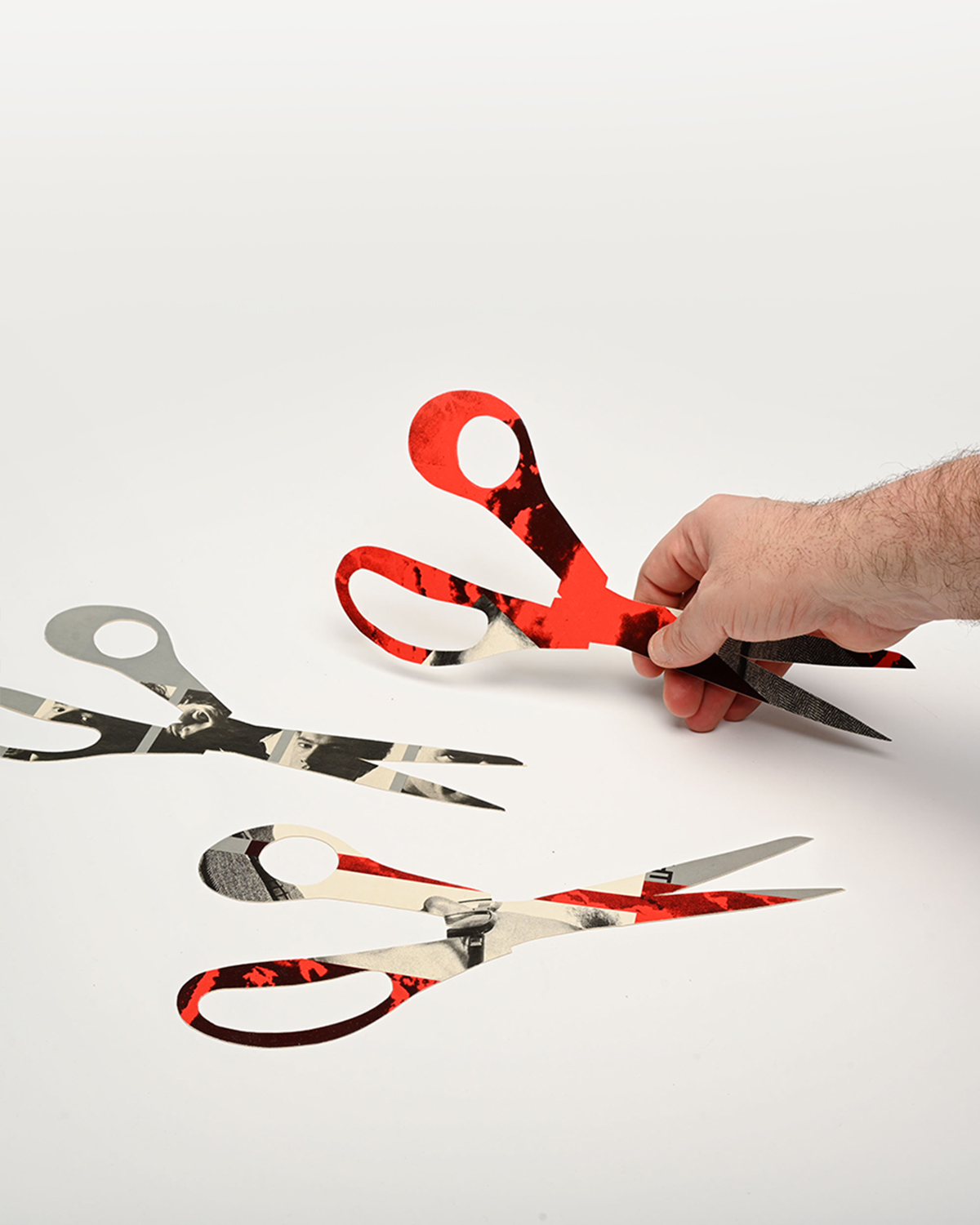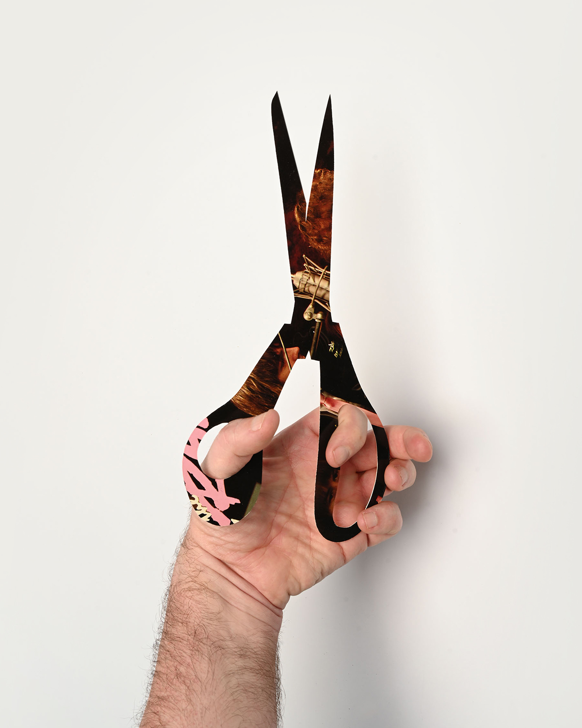 In this work, Rock Paper Scissors, A-FL has sourced a wide range of bargain bin albums from rock bands. On each album cover, the artist has traced and cut out the silhouette of a pair of Fiskars classic scissors. Drawing out the materiality of paper whilst describing the iconic object, the work collapses genre, material and form, until Rock Paper Scissors becomes a single object containing a web of intentions and significations.