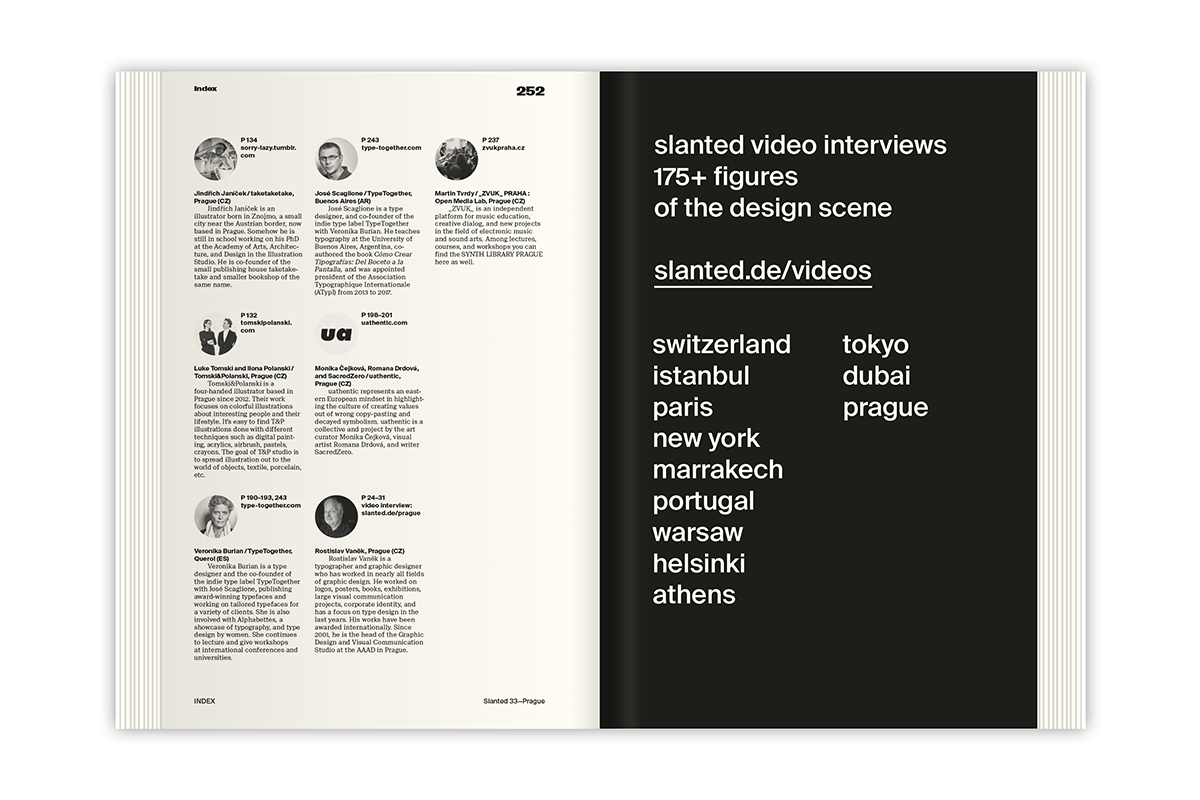 Slanted Magazine #33 comes with contributions by 20YY Designers, Patrik Antczak, Anymade Studio, Artishock, Michal Bačák, Peter Bankov, Filip Blažek, Braasi Industry, Briefcase Type Foundry, Tomáš Brousil, Monika Čejková, Čezeta motors, Anežka Hrubá Ciglerová, Design Herynek, Displaay, Petra Dočekalová, Kristina Fišerová, Fontstore, Karel Haloun, Heavyweight Digital Type Foundry, Martin Hrdina, Jitka Janečková, Kolektiv Studio, Jan Šrámek Kolouch, Linda Kudrnowská, Laboratoř, Františka Lachmanová, Zuzana Lednická, LINOSTOCK, Ian Lynam, Dermot Mac Cormack, Matýaš Machat, Man—Machine Type, Master & Master, Simon Matejka, Monsters, Veronika Rút Nováková, Oficina, OKOLO, PageFive, Parallel Practice, PBG, Pavla Pauknerová, Tomáš Pospiszyl, ReDesign, Rosetta Type Foundry, Side2, Radek Sidun, Adam Štěch, Storm Type Foundry, Studio adela&pauline, Studio Marvil, Studio Najbrt, Studio Novák & Balihar, Studio Petrohrad, Suitcase Type Foundry, Superior Type, superlative.works, Marta Sylvestrová, taketaketake, Tomski&Polanski, TypeTogether, uathentic, Rostislav Vaněk, and _ZVUK_.