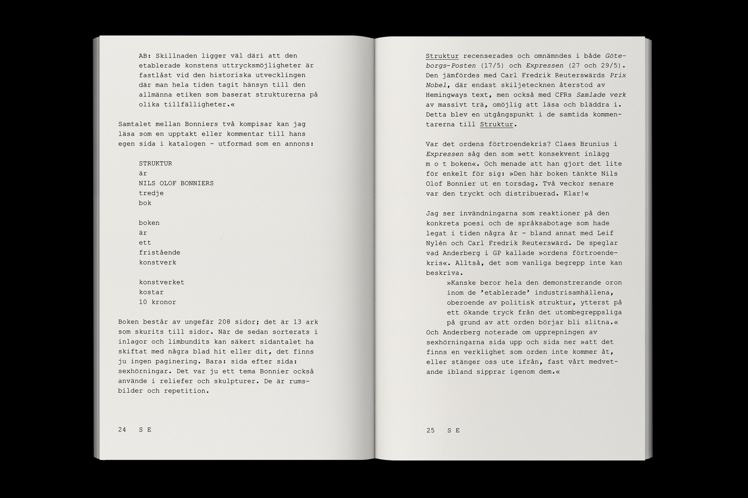 With the support of Nils Olof Bonnier’s son, Mikael, we are pleased to announce that LL’Editions has now released a faithful facsimile edition of Struktur. The book is accompanied by a second volume featuring an essay by Thomas Millroth, which contextualizes Bonnier’s life and work while also challenging the prevailing historical narrative of his disappearance. The essay is presented in both Swedish and in an English translation by Samuel Teeland.