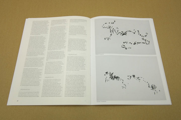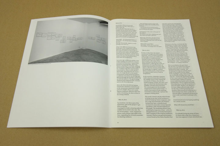 This fifth volume with art projects by Irene Kopelman consists of three sets of drawings made in the Amazon rainforest (Light Fragments, From the River, Forest Windows), and a set of paintings (Forest Windows). Besides reproductions of the complete series, the book contains detailed work notes covering Kopelman's stay in the jungle from May 9 till June 20, 2012. In contrast to the wideness of the landscapes of rocks and glaciers she has previously worked on to reproduce in detail, Kopelman experienced an opposite of distance by working in a jungle that entirely surrounded her. Edited by Moosje Goosen. Design: Roger Willems. Text in English and Spanish. Link: www.kunsthallesanktgallen.ch