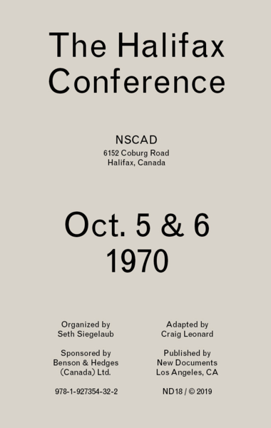 The Halifax Conference is a transcript and script of a conference held at the Nova Scotia College of Art and Design on October 5–6, 1970, transcribed and adapted by artist Craig Leonard. Organized by Seth Siegelaub, the Conference was conceived as a means of bringing about a “meeting of artists…[from] diverse art making experiences and art positions…in as general a situation as possible.” Infamously, the conference was held in the college’s boardroom, while students and other interested parties watched the proceedings on a video monitor in a separate space. The result was a conversation that devolved—technologically and ideologically—into a quasi-tragicomic farce, punctuated by remarkable moments of rupture initiated by activist resistance to the Conference from the outside and dissenting voices from within. Attendees at the Conference included Carl Andre, Joseph Beuys, Ronald Bladen, Daniel Buren, Gene Davis, Jan Dibbets, Al Held, Mario Merz, Robert Morris, Robert Murray, N.E.Thing Co. (Iain and Ingrid Baxter), Richard Serra, Richard Smith, Robert Smithson, Michael Snow, and Lawrence Weiner.