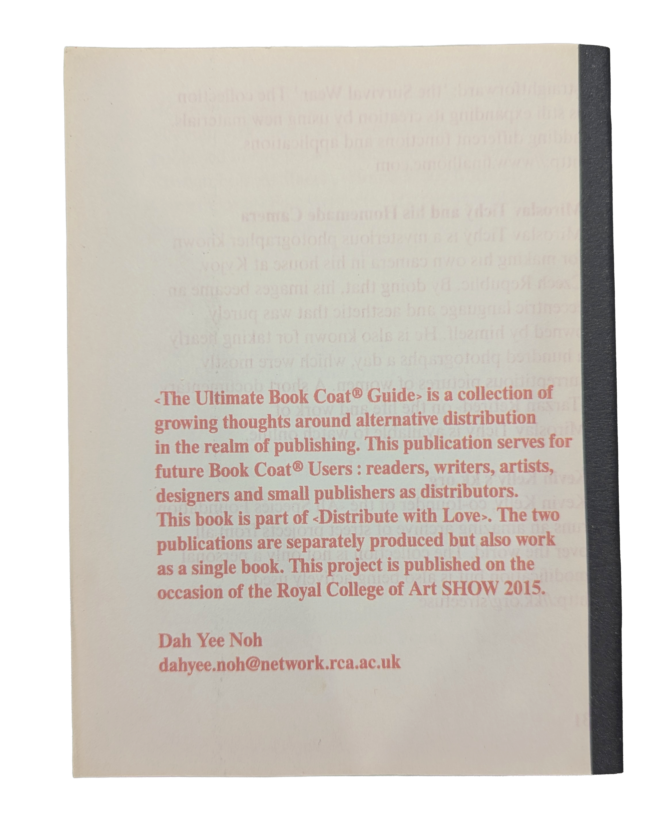 The Ultimate Book Coat® Guide is a collection of growing thoughts around alternative distribution in the realm of publishing. This publication serves for future Book Coat® Users: readers, writers, artists, designers and small publishers as distributors. This book is part of Distribute with Love». The two publications are separately produced but also work as a single book. This project is published on the occasion of the Royal College of Art SHOW 2015.
