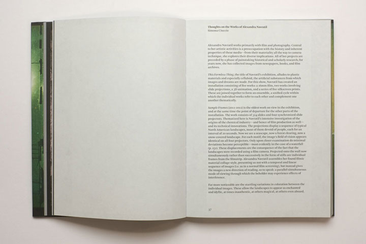 This Formless Thing alludes to materials and artificial substances from which images are made, like celluloid, photosensitive emulsion, and pigments. Around a series of five thematically complementing works by Navratil, seven text contributions where written by Jennifer Burris, Simona Ciuccio, Natasha Ginwala, Esther Leslie, Matthew Solomon, Jelena Rakin, and Mirjam Varadinis. Published in conjunction with a solo exhibition by Alexandra Navratil in Kunstmuseum Winterthur, travelling to SMBA, Amsterdam.