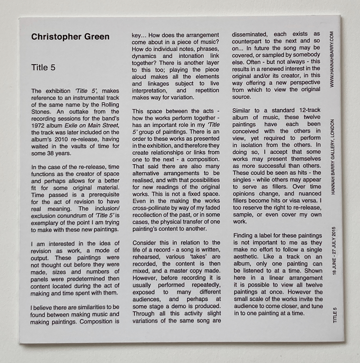 Exhibition catalogue for artist Christopher Green's 2015 solo exhibition at Hannah Barry Gallery, London. The booklet is reminiscent of an LP sleeve and features images of the 12 paintings exhibited and a text about the works.