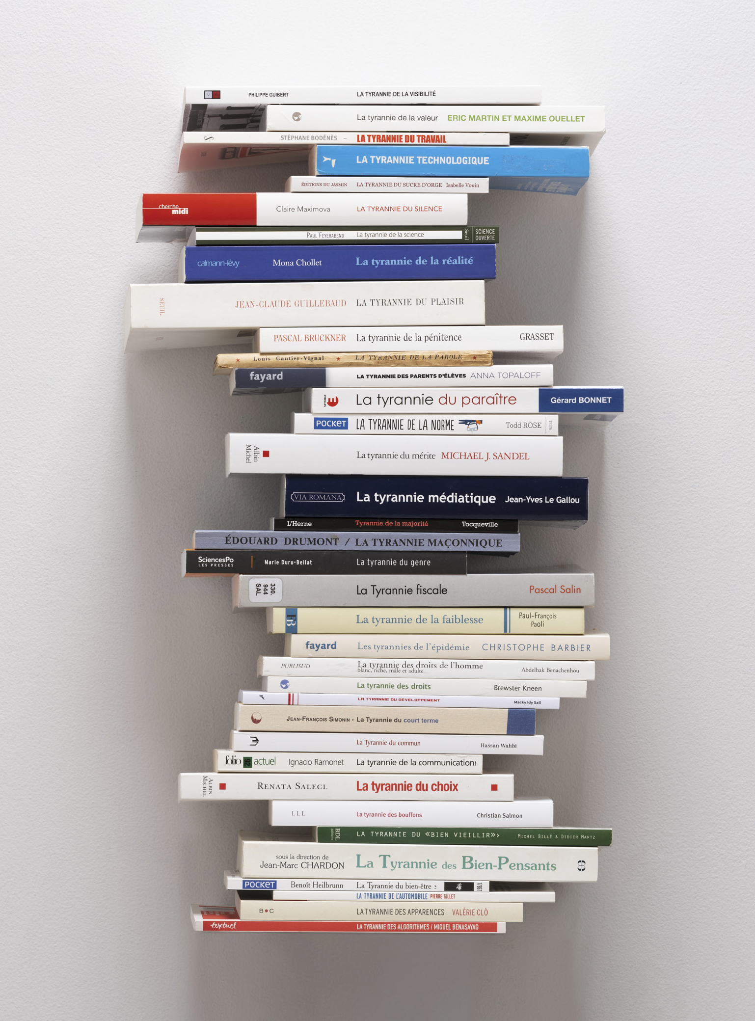 Forty books whose titles begin with ‘La tyrannie...’ (Tyranny...) are arranged in an unstable column so that the words on the spine are aligned to the left, making it easier to read the titles. The balance seems precarious at any moment.